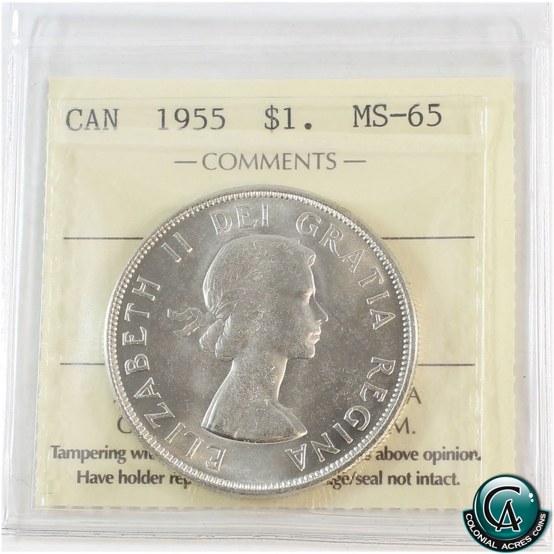 Silver $1 1955 ICCS Certified MS-65. A blast white coin with a soft satin finish.