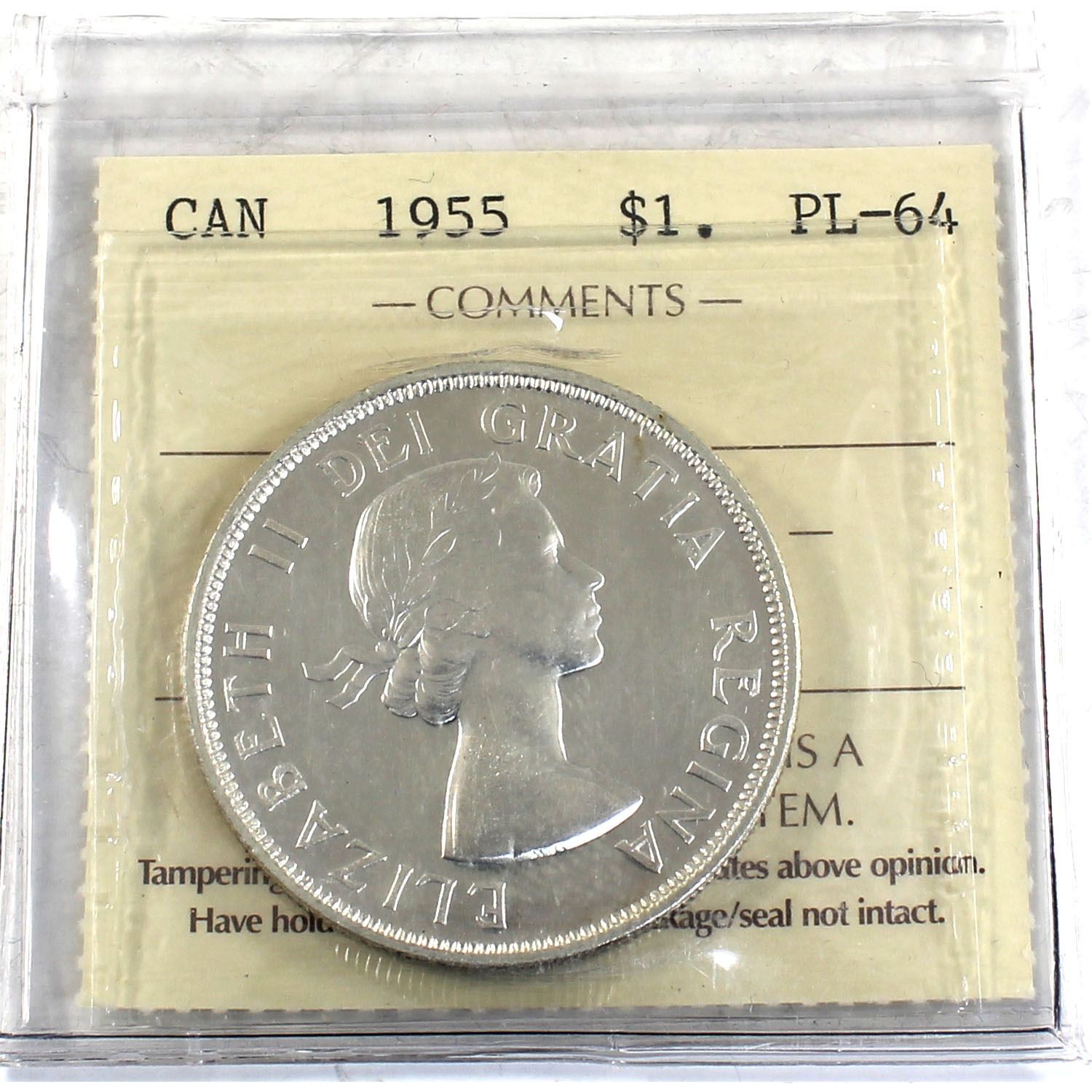 Silver $1 1955 ICCS Certified PL-64. Bright coin with soft cameo accents.
