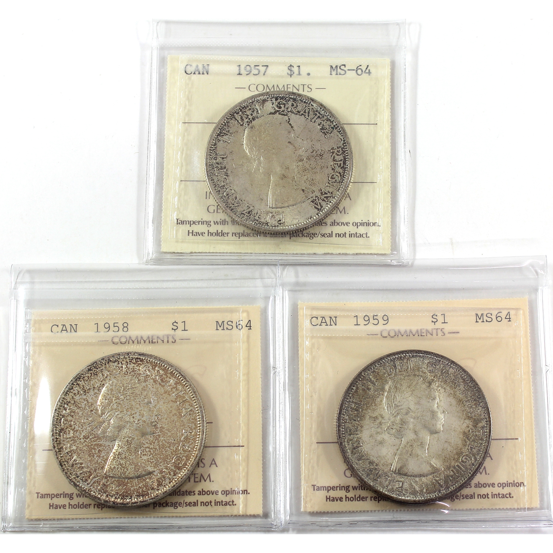 Silver $1 1957, 1958, & 1959 ICCS MS64. 3pcs.
