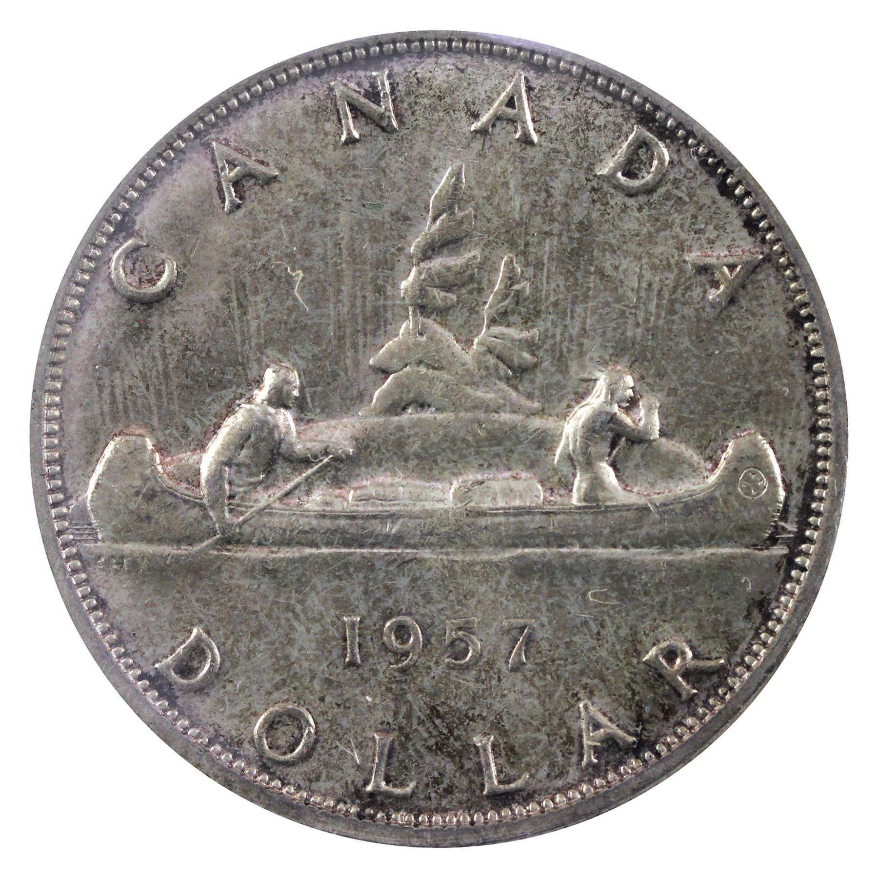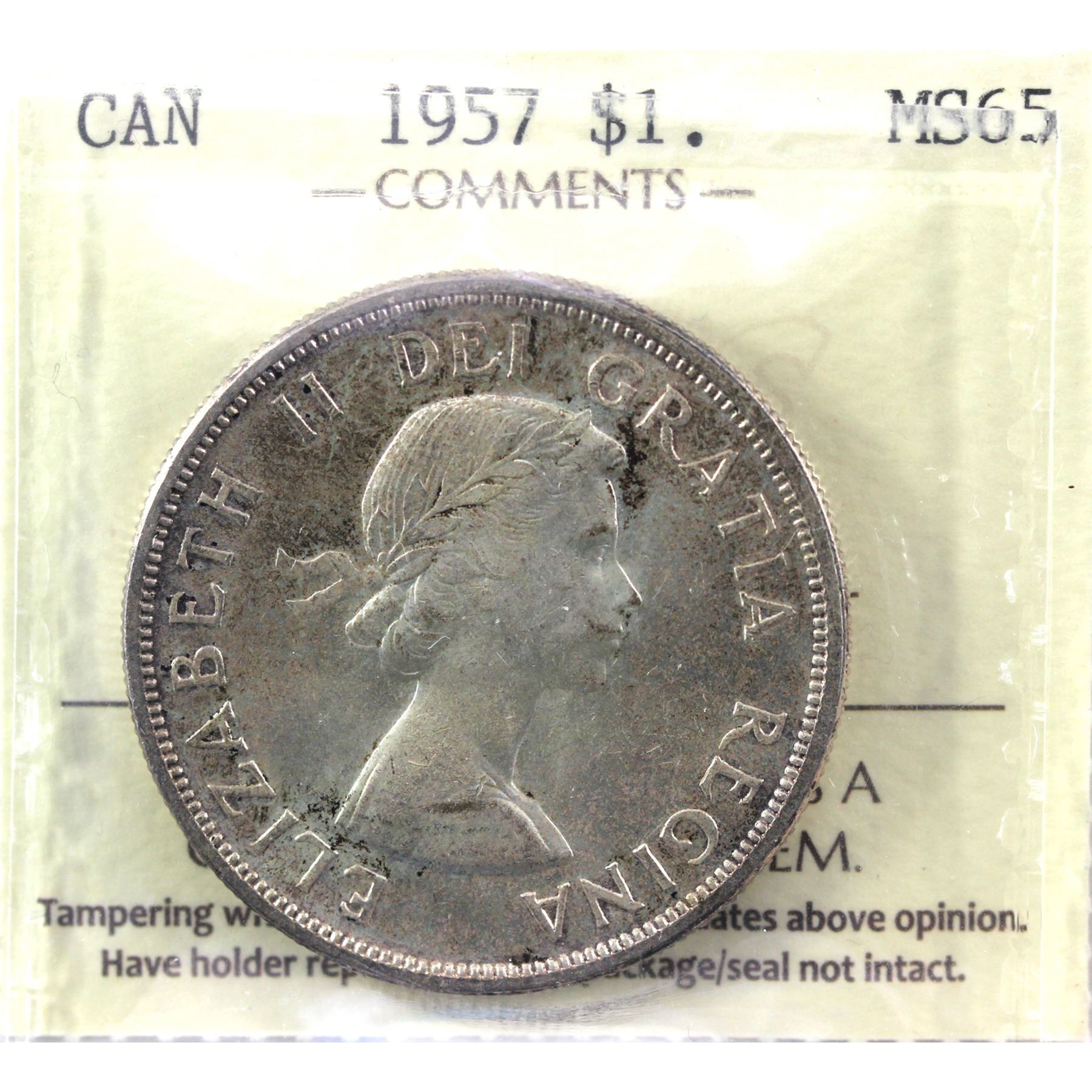 Silver $1 1957 ICCS Certified MS-65! Light violet tones over pristine fields.