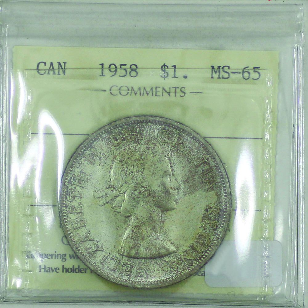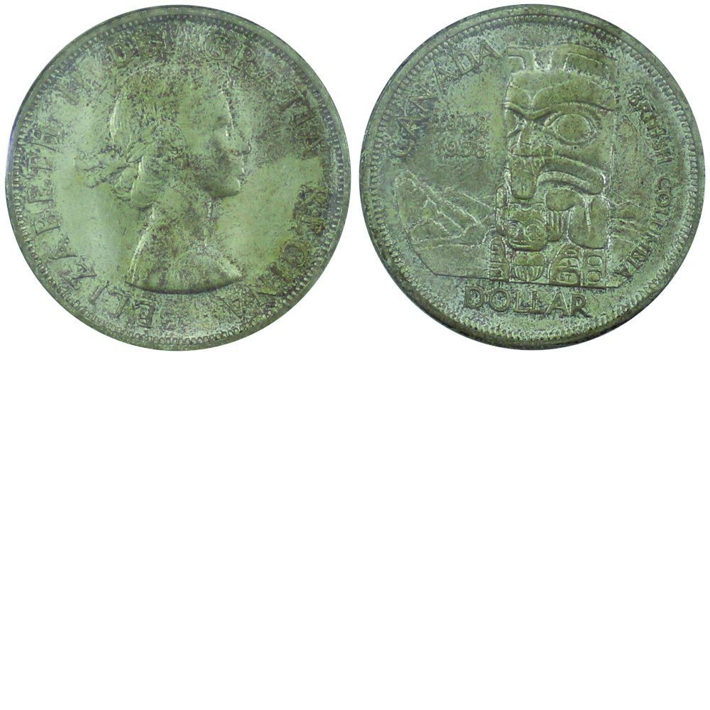 Silver $1 1958 British Columbia Totem Pole Commemorative. ICCS Certified MS-65 lightly toned with Pink and rose hues.