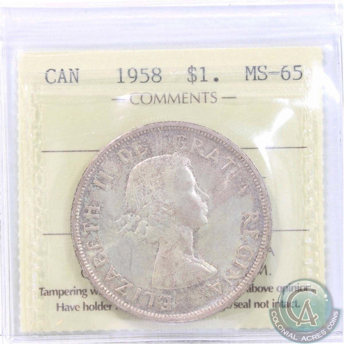 Silver $1 1958 ICCS Certified MS-65! Soft Rose toning over lustrous fields.