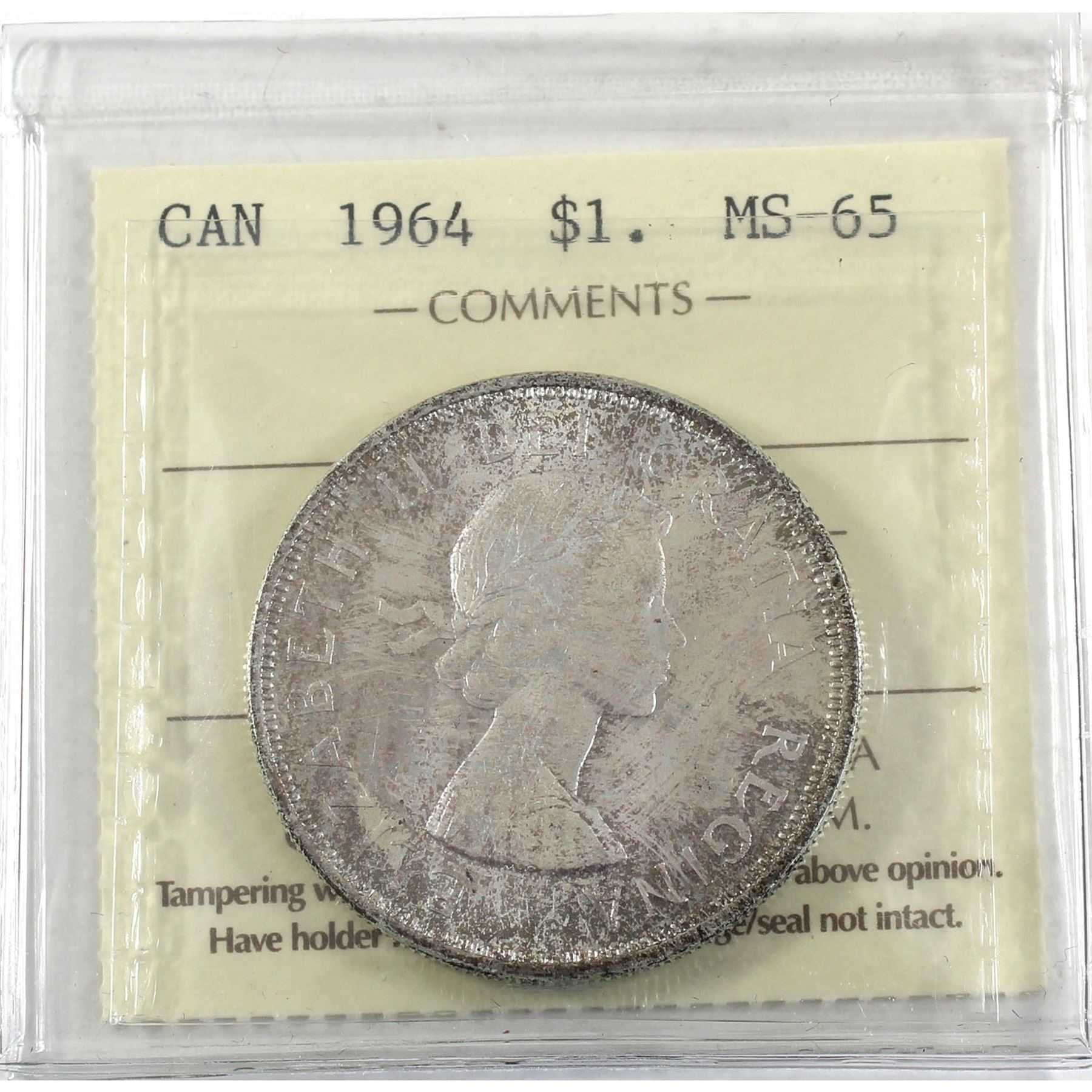 Silver $1 1964 ICCS Certified MS-65. Lightly toned over frosted white fields.