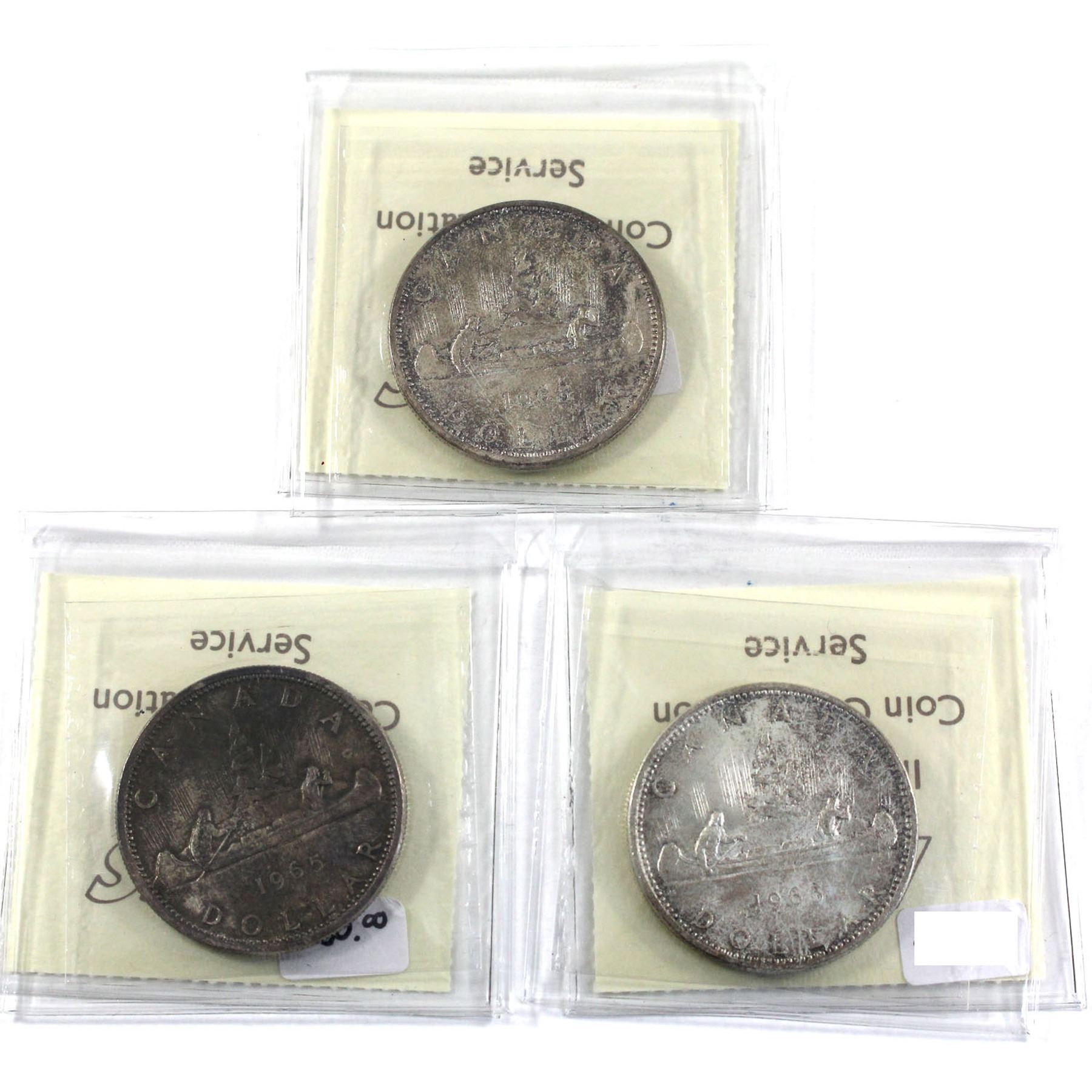 Silver $1 1965 LgeBds Blunt 5 SmBds Blt 5, & SmBds Ptd 5 all ICCS Certified MS-64 lightly toned (3pcs)
