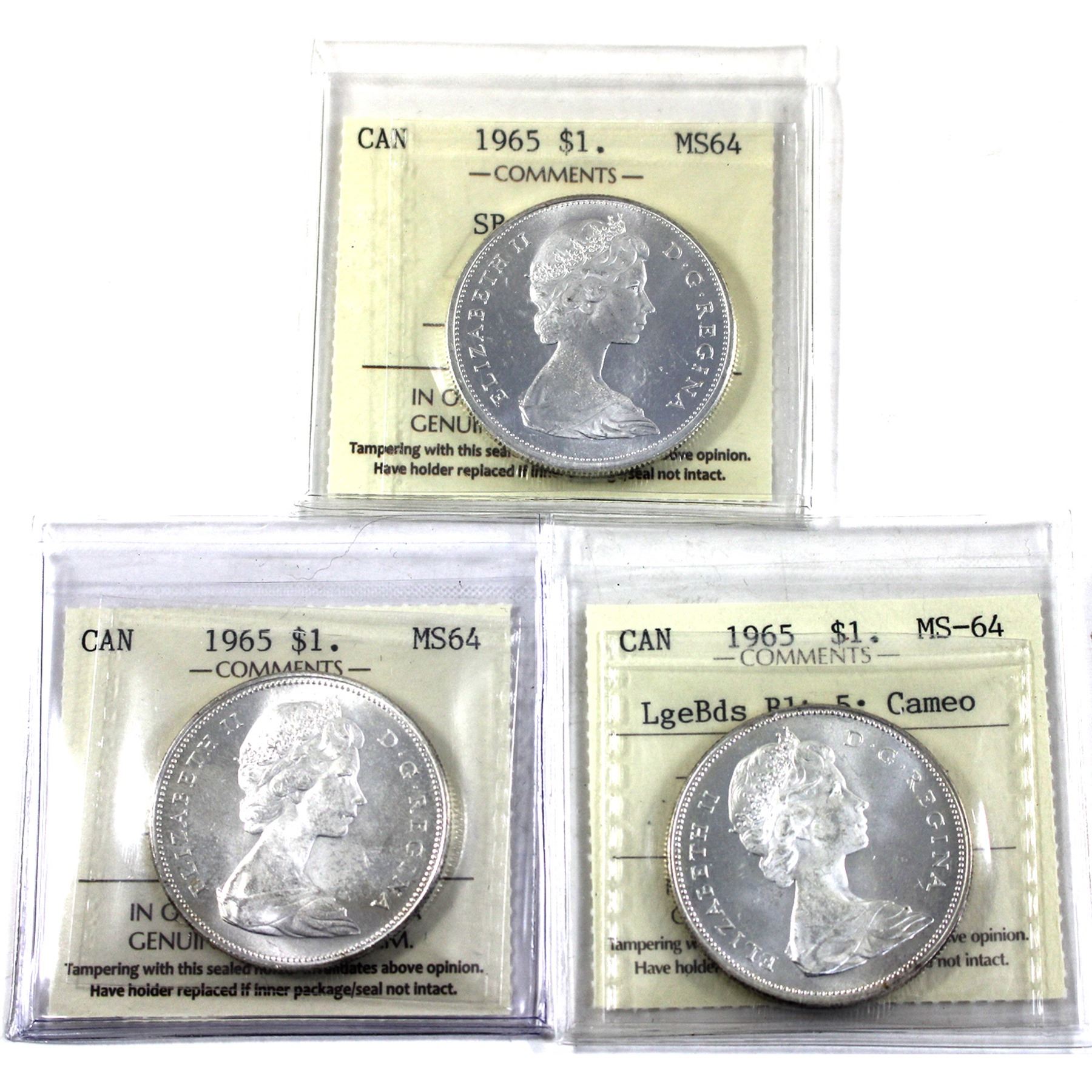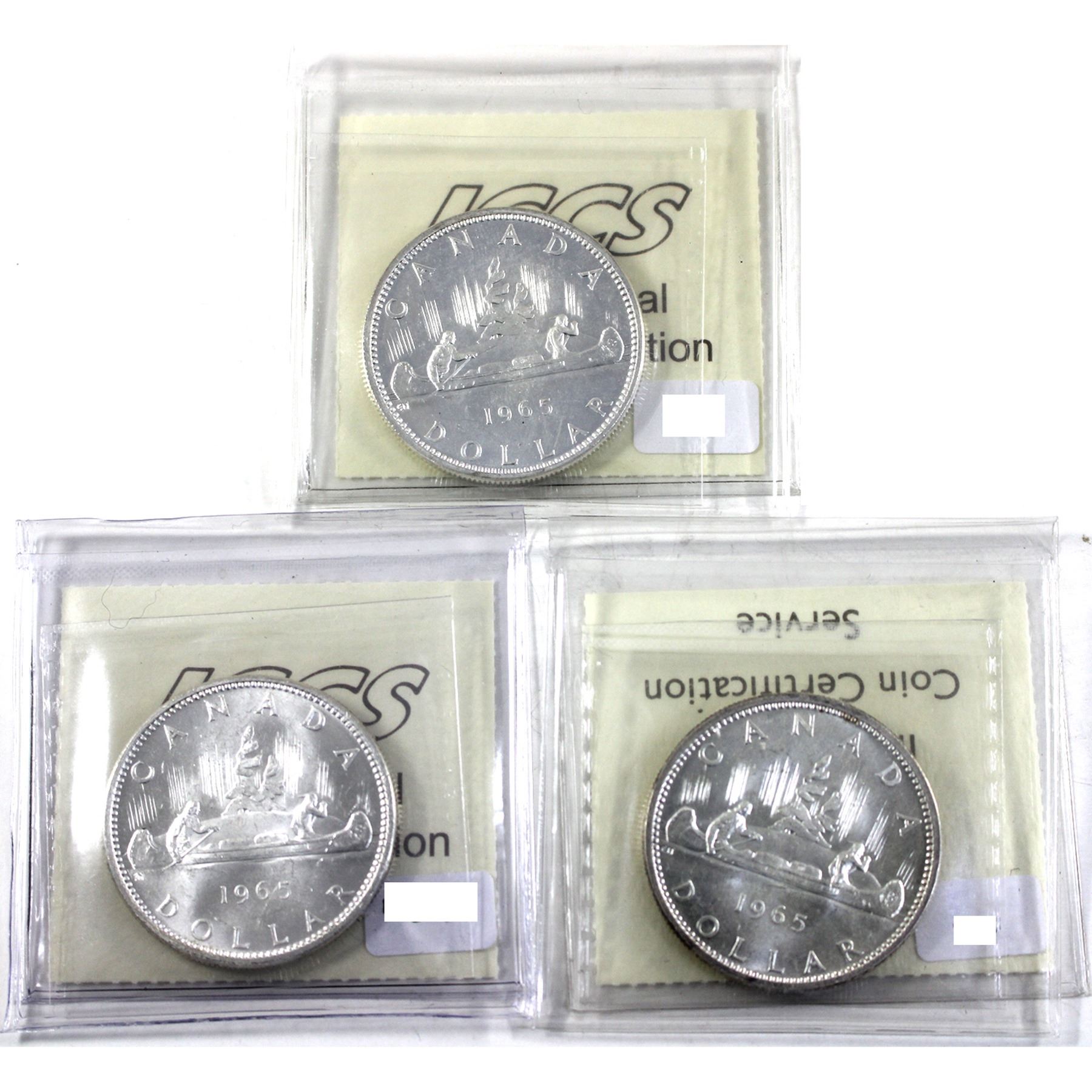 Silver $1 1965 SB P5, 1965 LB B5 Cameo & 1965 LB P5 ICCS Certified MS64. 3pcs.