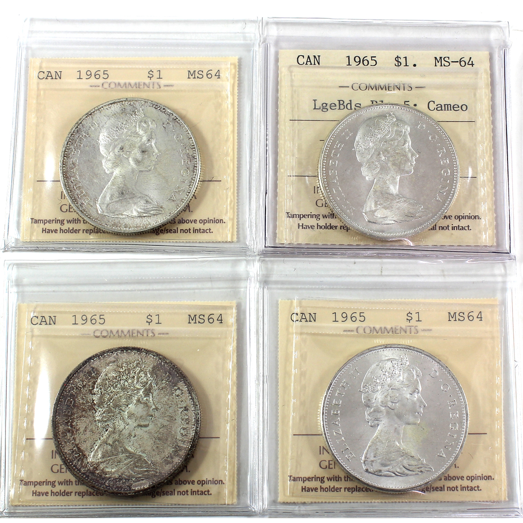 Silver $1 1965; SB P5 (T1), SB B5 (T2), LB B5 (T3) Cameo, & MB P5 (T5); ICCS MS64. 4pcs.