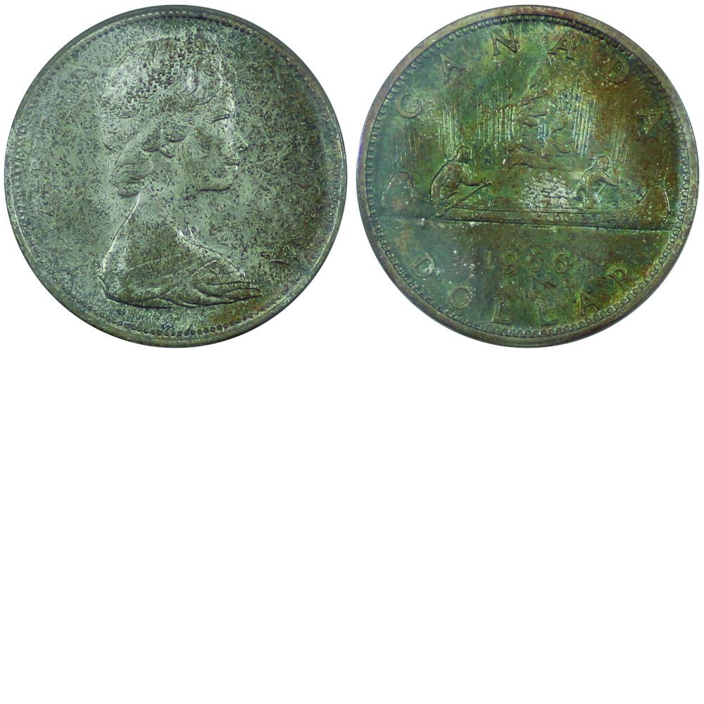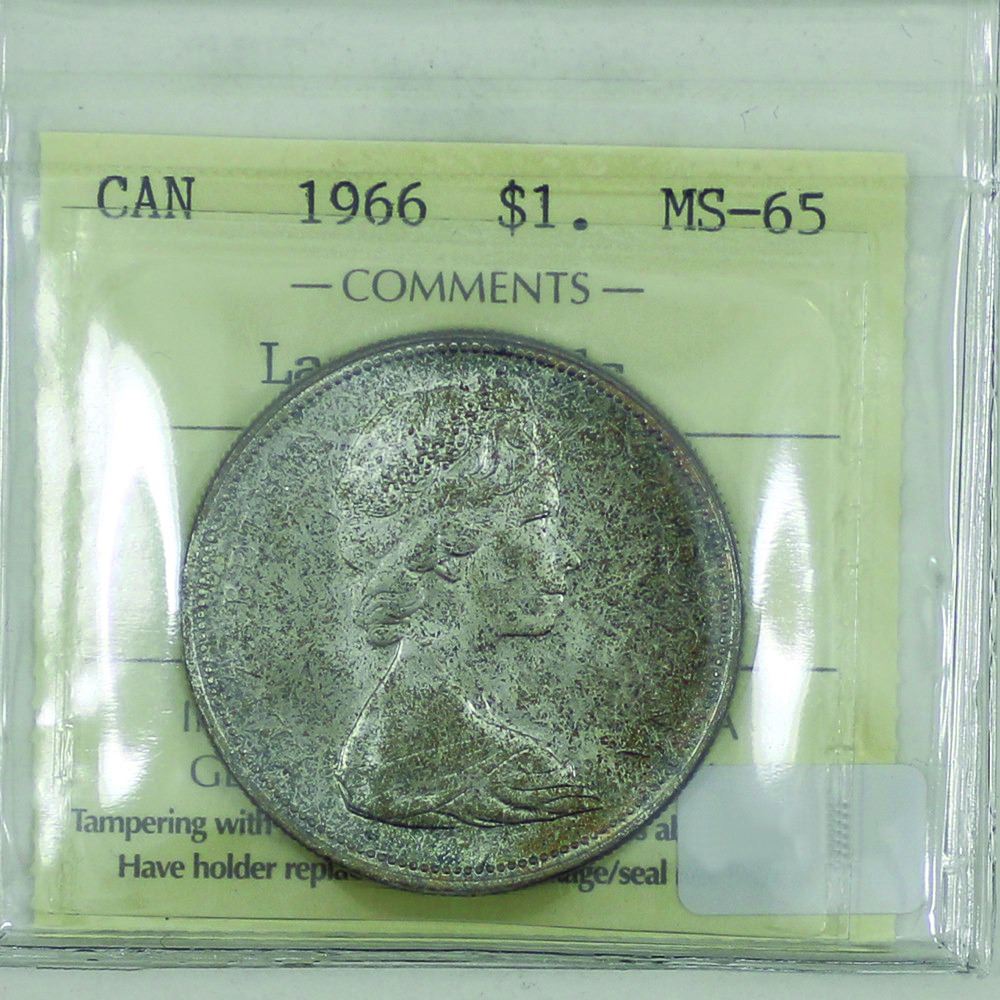 Silver $1 1966 Large Beads ICCS Certified MS-65! An exceptionally toned coin with near flawless fields. Coin exhibits attractive tones of indigo blues, greens and hints of golden. A choice coin!