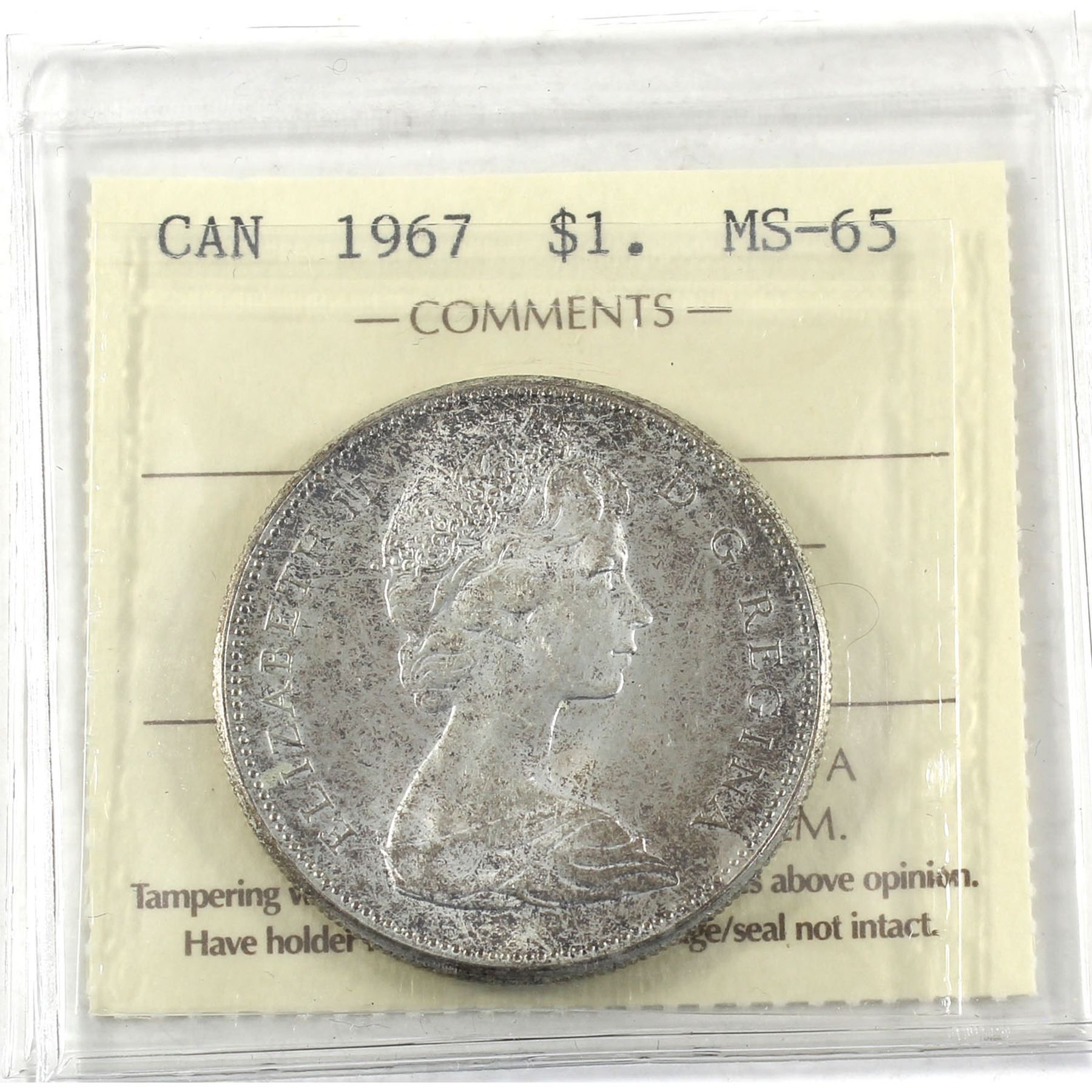Silver $1 1967 ICCS Certified MS-65. Light toning throughout with exceptional field quality.