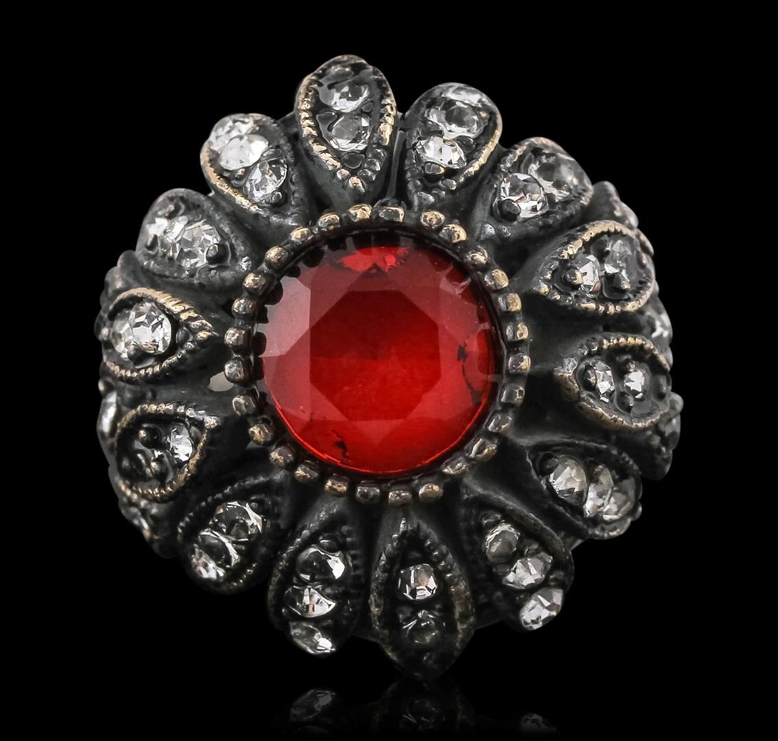 One electronically tested silver lab created multi gemstone ring. The ring features a lab created red crystal set within a cubic zirconia encrusted bombe style curvature, completed by a four millimeter wide band. Bright and anodized finish with yellow gold accents. Identified with markings of "925". Condition is new, good workmanship. Containing: One bezel set round brilliant cut laboratory created red crystal, measuring 10.00 - 10.00 x 5.80 mm, approximate weight of 1.45ct., clarity is eye clean, dark, very slightly brownish, orangy red color, (GIA oR 7/3), cut is good. Transmitting light with no distortion, transparent. Graded in the setting. Forty-eight prong set round brilliant cut laboratory created cubic zirconias, measuring 2.30 - 2.20 x 1.46 mm, approximate total weight of 4.32ct., clarity is eye clean, colorless, very slightly grayish, white color, (GIA W 0/3), cut is good. Transmitting light with no distortion, transparent. Color grade is an average for the group. Graded in the setting. Total Weight of Colored Stones 5.77ct. Total Weight of Ring 14.06gm. AIG Appraised at $1,080.00. AIG Appraised at $1,080.00.