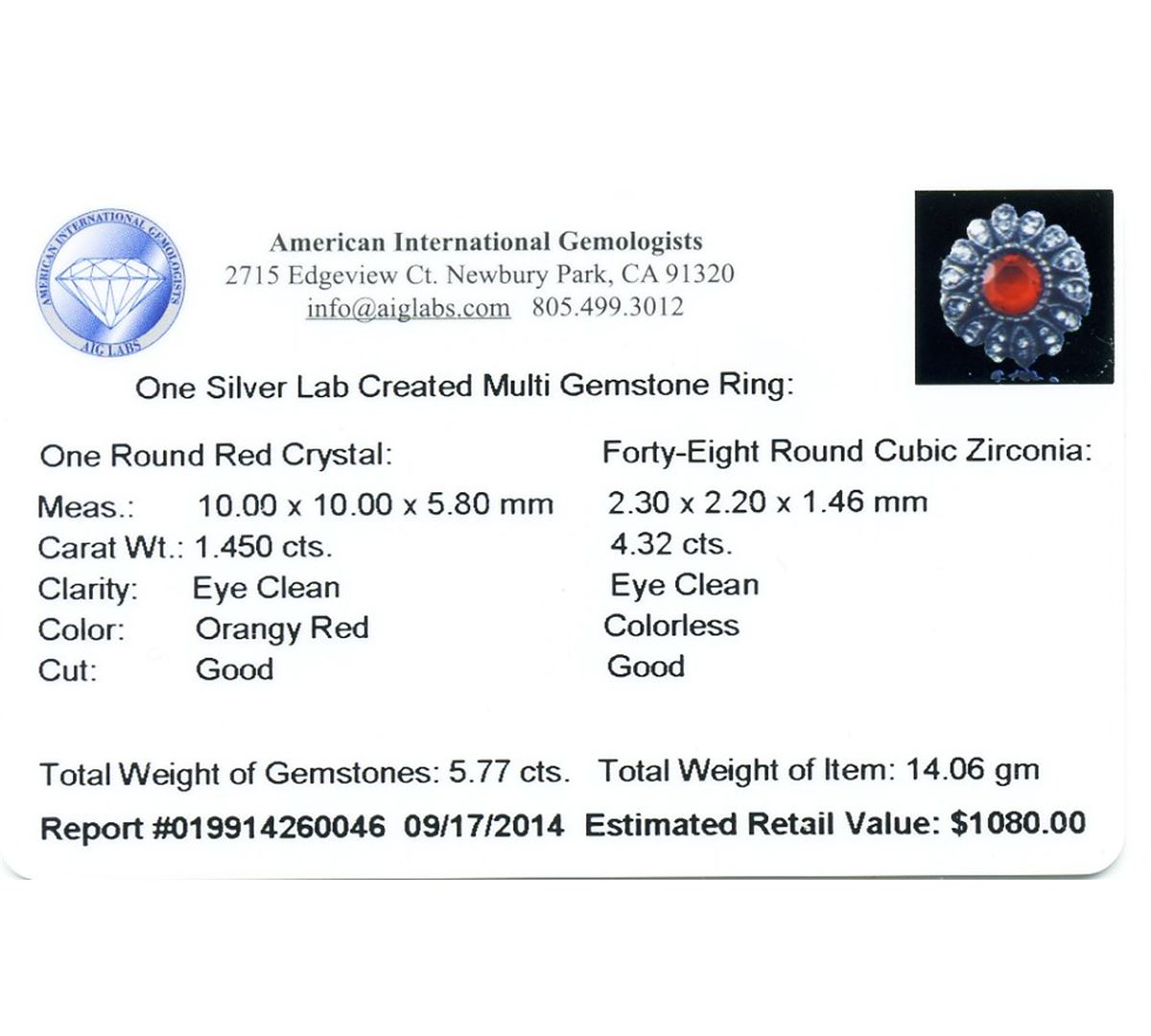 One electronically tested silver lab created multi gemstone ring. The ring features a lab created red crystal set within a cubic zirconia encrusted bombe style curvature, completed by a four millimeter wide band. Bright and anodized finish with yellow gold accents. Identified with markings of "925". Condition is new, good workmanship. Containing: One bezel set round brilliant cut laboratory created red crystal, measuring 10.00 - 10.00 x 5.80 mm, approximate weight of 1.45ct., clarity is eye clean, dark, very slightly brownish, orangy red color, (GIA oR 7/3), cut is good. Transmitting light with no distortion, transparent. Graded in the setting. Forty-eight prong set round brilliant cut laboratory created cubic zirconias, measuring 2.30 - 2.20 x 1.46 mm, approximate total weight of 4.32ct., clarity is eye clean, colorless, very slightly grayish, white color, (GIA W 0/3), cut is good. Transmitting light with no distortion, transparent. Color grade is an average for the group. Graded in the setting. Total Weight of Colored Stones 5.77ct. Total Weight of Ring 14.06gm. AIG Appraised at $1,080.00. AIG Appraised at $1,080.00.
