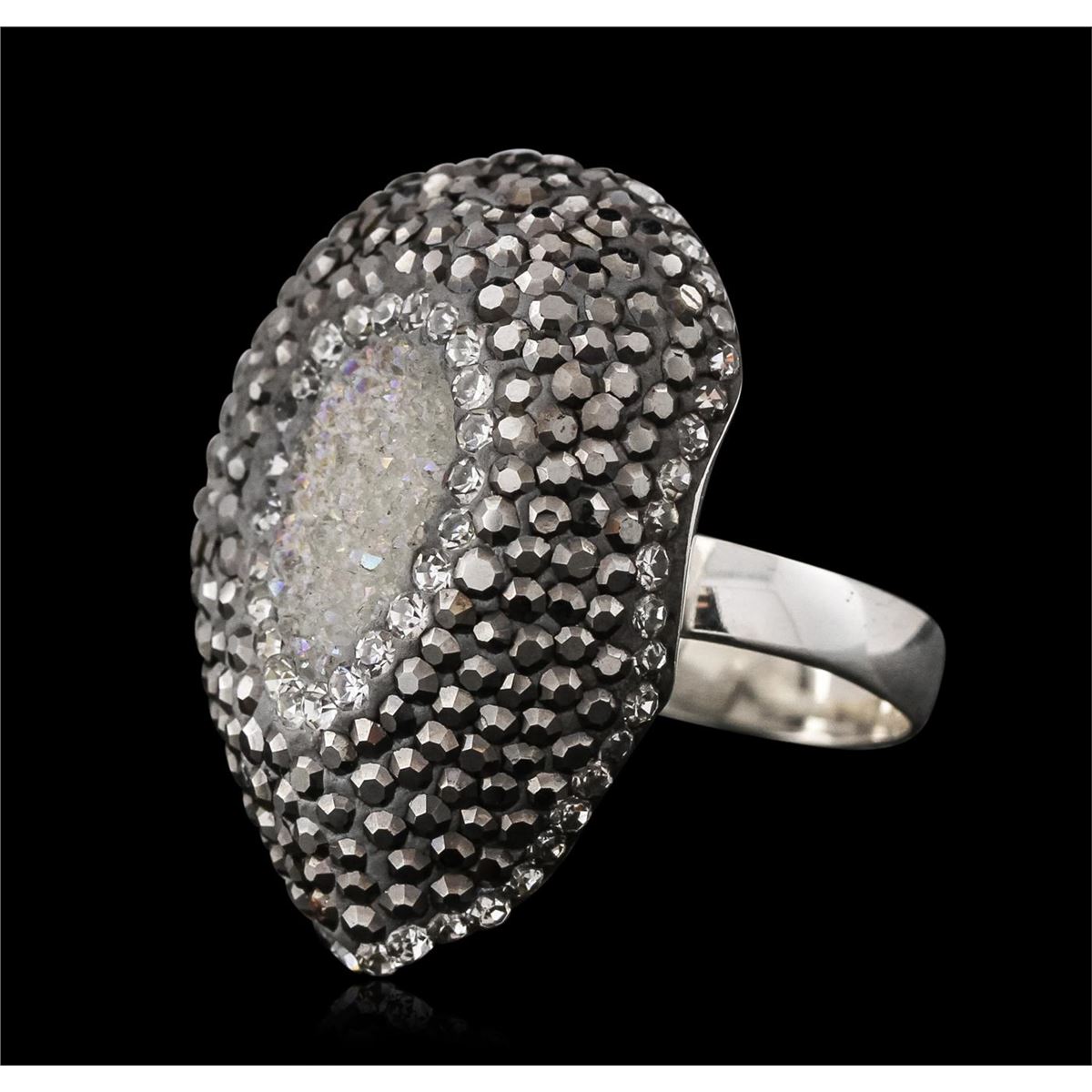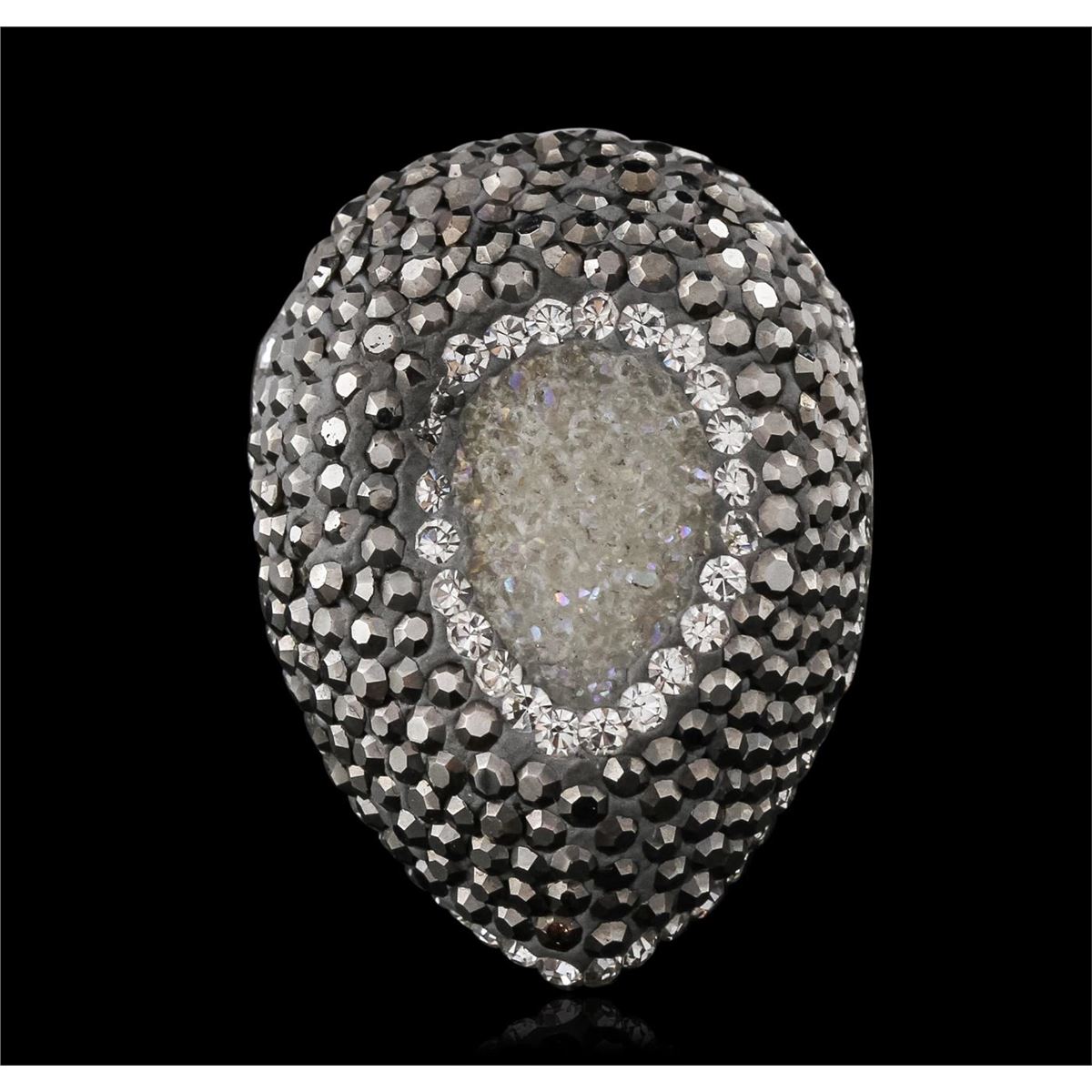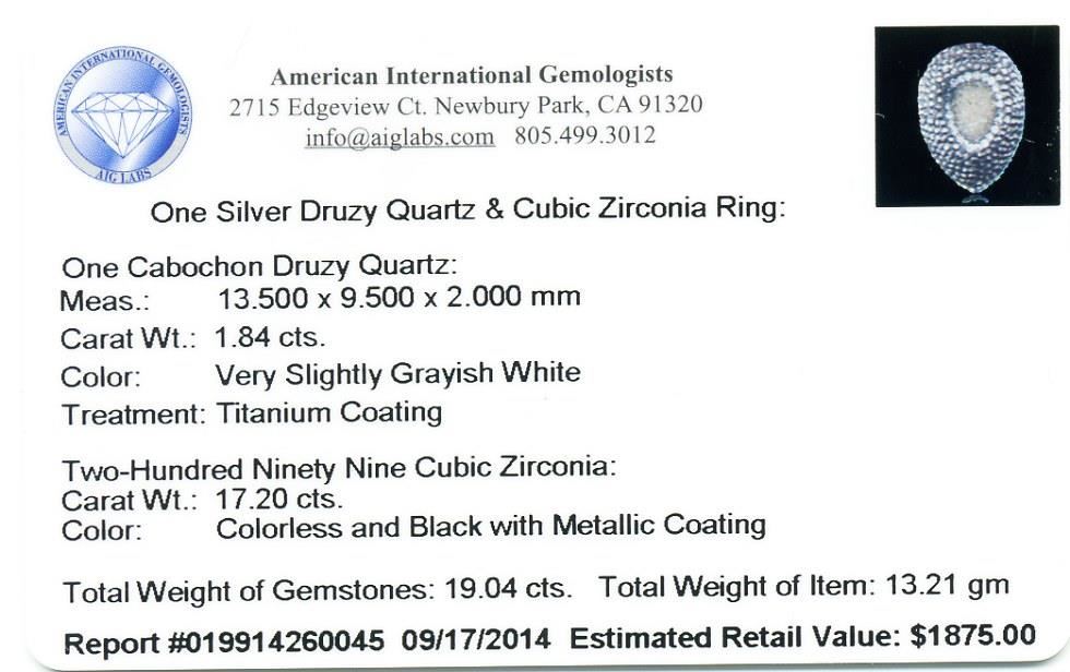 One electronically tested silver druzy quartz & cubic zirconia ring. Condition is new, good workmanship. Containing: One bezel set pear cabochon cut natural druzy quartz, measuring 13.50 x 9.50 x 2.00mm, approximate weight of 1.84ct., colorless, very slightly grayish, white color, (GIA W 0/3), cut is good. Transmitting light very diffusely, opaque. Naturally occurring internal & external characteristics are present. Indications of laboratory titanium coating. Graded in the setting. Seventy-four bead set round brilliant cut laboratory created cubic zirconias, measuring 1.90 - 1.80 x 1.20 mm, approximate total weight of 3.70ct., clarity is eye clean, colorless, very slightly grayish, white color, (GIA W 0/3), cut is good. Transmitting light with no distortion, transparent. Color grade is an average for the group. Graded in the setting. Two hundred twenty-five bead set round brilliant cut laboratory created cubic zirconias, measuring 2.10 - 2.00 x 1.23 mm, approximate total weight of 13.50ct., dark, very slightly grayish, black color, (GIA Bl 7/3), cut is good. Transmitting light very diffusely, opaque. Color grade is an average for the group. Indications of laboratory metallic coating. Graded in the setting. Total Weight of Colored Stones 19.04ct. Total Weight of Ring 13.21gm. AIG Appraised at $1,875.00. AIG Appraised at $1,875.00.