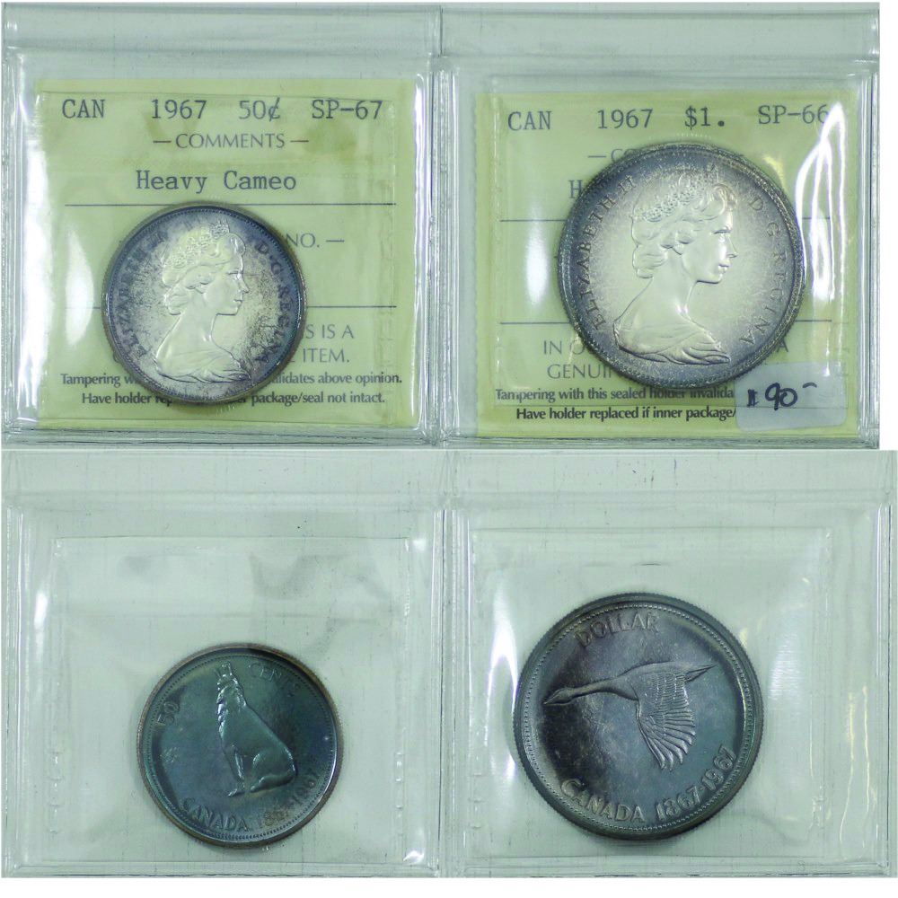 Silver $1 and 50-cent 1967 Specimen combo. Both coins are ICCS Graded (SP-66 HC & SP-67 HC) and exhibit choice toning with deep indigo blues and purple on the reverse with bullseye toning with deep Heavy Cameos on the Obverse.