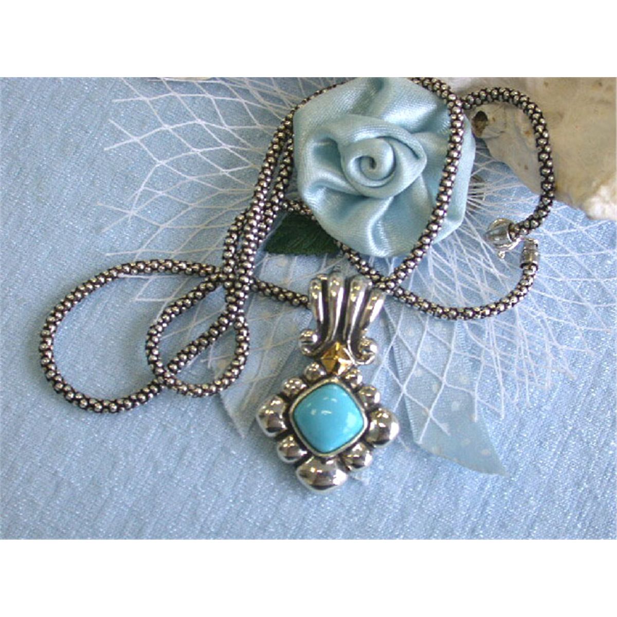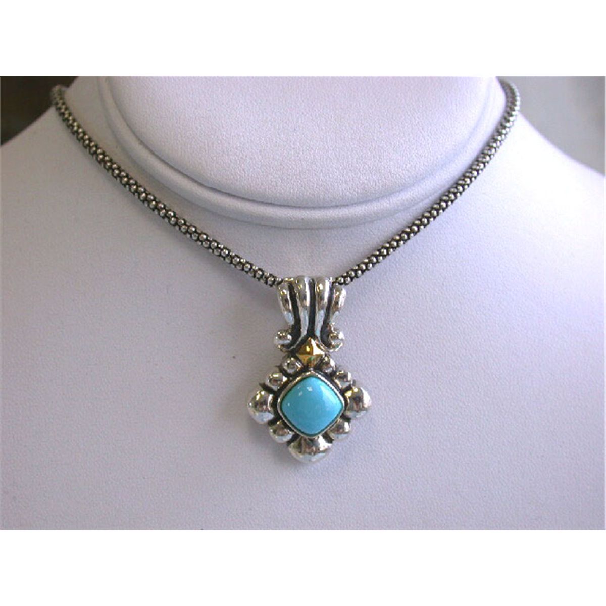 Silver and 14k Yellow Gold Necklace with Turquoise. The length is approximately 19.5 inches long (chain) and weighs 20. grams