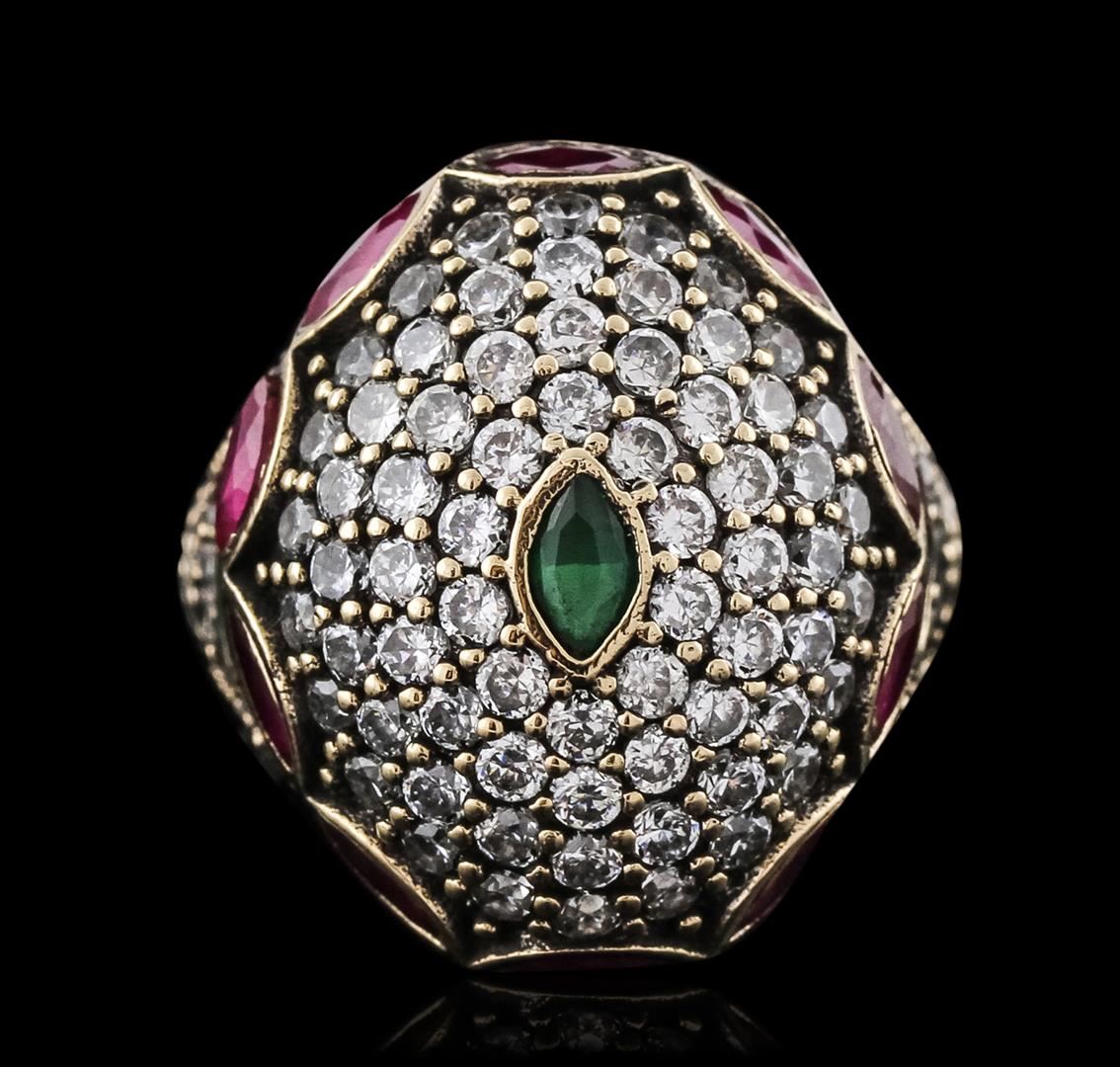 One electronically tested silver lab created multi gemstone ring. The ring features a lab created emerald set within multiple cubic zirconia bezels and a lab created ruby bezel supported by lab created emerald and cubic zirconia shoulders, completed by a three millimeter wide band. Bright and anodized finish with rope detailing and yellow gold accents. Identified with markings of "925". Condition is new, good workmanship. Containing: Three bezel set marquise mixed cut laboratory created emeralds, measuring 5.00 x 3.00 x 1.95mm, approximate total weight of 0.45ct., clarity is eye clean, type III, medium dark, moderately strong, green color, (GIA G 6/4), cut is good. Transmitting light with no distortion, transparent. Measurements & the color grade are an average for the group. Graded in the setting. Ten bezel set marquise mixed cut laboratory created rubies, measuring 5.00 x 3.00 x 1.95mm, approximate total weight of 2.20ct., clarity is eye clean, type II, dark, very slightly brownish, slightly purplish red color, (GIA slpR 7/3), cut is good. Transmitting light with no distortion, transparent. Measurements & the color grade are an average for the group. Graded in the setting. Eighty-two prong set round brilliant cut laboratory created cubic zirconias, measuring 2.10 - 2.00 x 1.33 mm, approximate total weight of 5.74ct., clarity is eye clean, colorless, very slightly grayish, white color, (GIA W 0/3), cut is good. Transmitting light with no distortion, transparent. Color grade is an average for the group. Graded in the setting. Total Weight of Colored Stones 8.39ct. Total Weight of Ring 11.70gm. AIG Appraised at $1,120.00. AIG Appraised at $1,120.00.