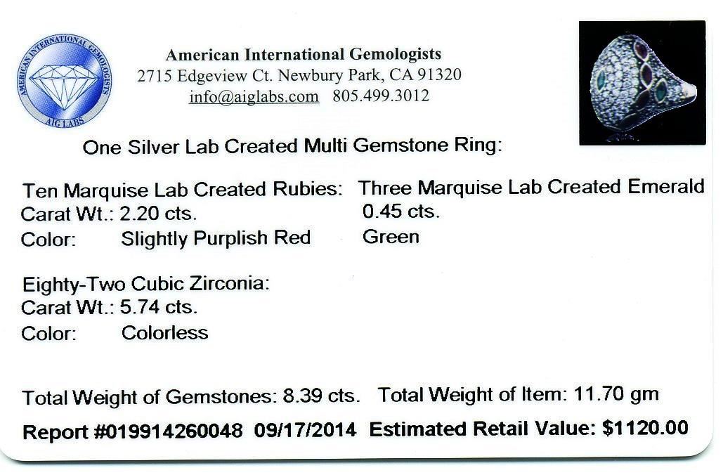 One electronically tested silver lab created multi gemstone ring. The ring features a lab created emerald set within multiple cubic zirconia bezels and a lab created ruby bezel supported by lab created emerald and cubic zirconia shoulders, completed by a three millimeter wide band. Bright and anodized finish with rope detailing and yellow gold accents. Identified with markings of "925". Condition is new, good workmanship. Containing: Three bezel set marquise mixed cut laboratory created emeralds, measuring 5.00 x 3.00 x 1.95mm, approximate total weight of 0.45ct., clarity is eye clean, type III, medium dark, moderately strong, green color, (GIA G 6/4), cut is good. Transmitting light with no distortion, transparent. Measurements & the color grade are an average for the group. Graded in the setting. Ten bezel set marquise mixed cut laboratory created rubies, measuring 5.00 x 3.00 x 1.95mm, approximate total weight of 2.20ct., clarity is eye clean, type II, dark, very slightly brownish, slightly purplish red color, (GIA slpR 7/3), cut is good. Transmitting light with no distortion, transparent. Measurements & the color grade are an average for the group. Graded in the setting. Eighty-two prong set round brilliant cut laboratory created cubic zirconias, measuring 2.10 - 2.00 x 1.33 mm, approximate total weight of 5.74ct., clarity is eye clean, colorless, very slightly grayish, white color, (GIA W 0/3), cut is good. Transmitting light with no distortion, transparent. Color grade is an average for the group. Graded in the setting. Total Weight of Colored Stones 8.39ct. Total Weight of Ring 11.70gm. AIG Appraised at $1,120.00. AIG Appraised at $1,120.00.