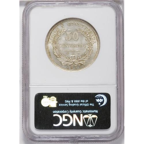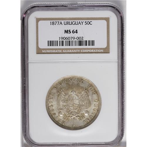 <B>Republic 50 Centesimos 1877-A,</B></I> KM-16, MS64 NGC, light silvery gold toning, a beauty.<BR><BR><b>Shipping:</b> Coin/Currency (<a target="_blank" href="http://www.heritageauctions.com/common/shipping.php">view shipping information</a>)