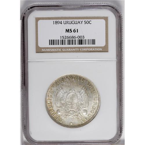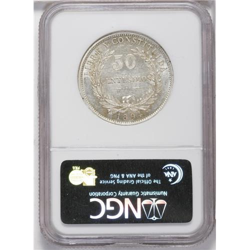 <B>Republic 50 Centesimos 1894,</B></I> KM-16, MS61 NGC, lots of tiny abrasions but this sure looks choice, with lovely silvery gold iridescence and strong luster.<BR><BR><b>Shipping:</b> Coin/Currency (<a target="_blank" href="http://www.heritageauctions.com/common/shipping.php">view shipping information</a>)
