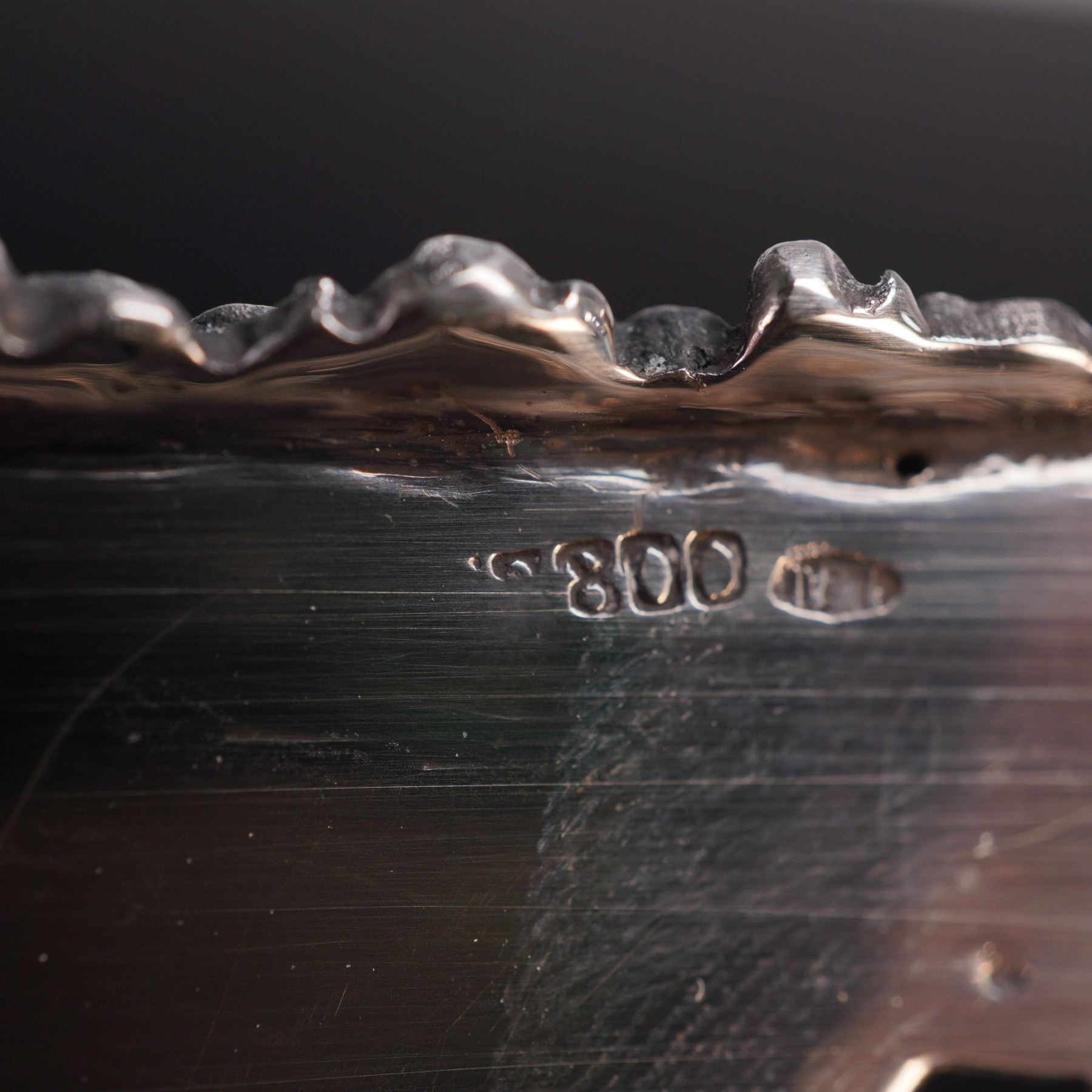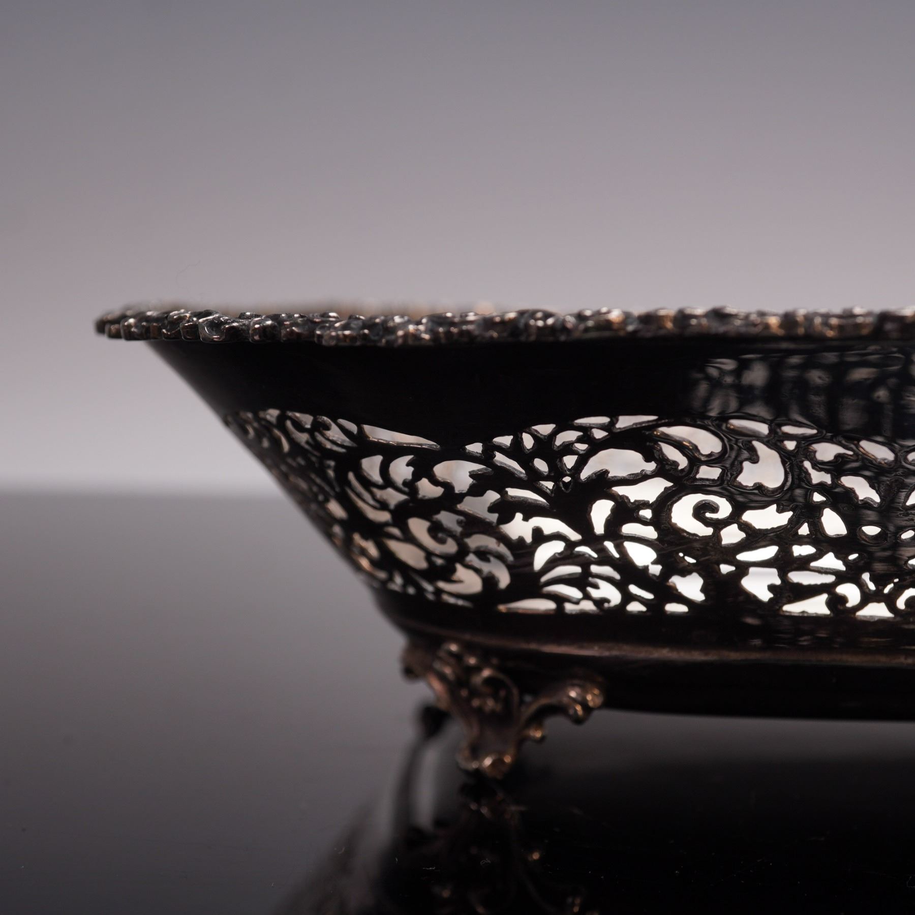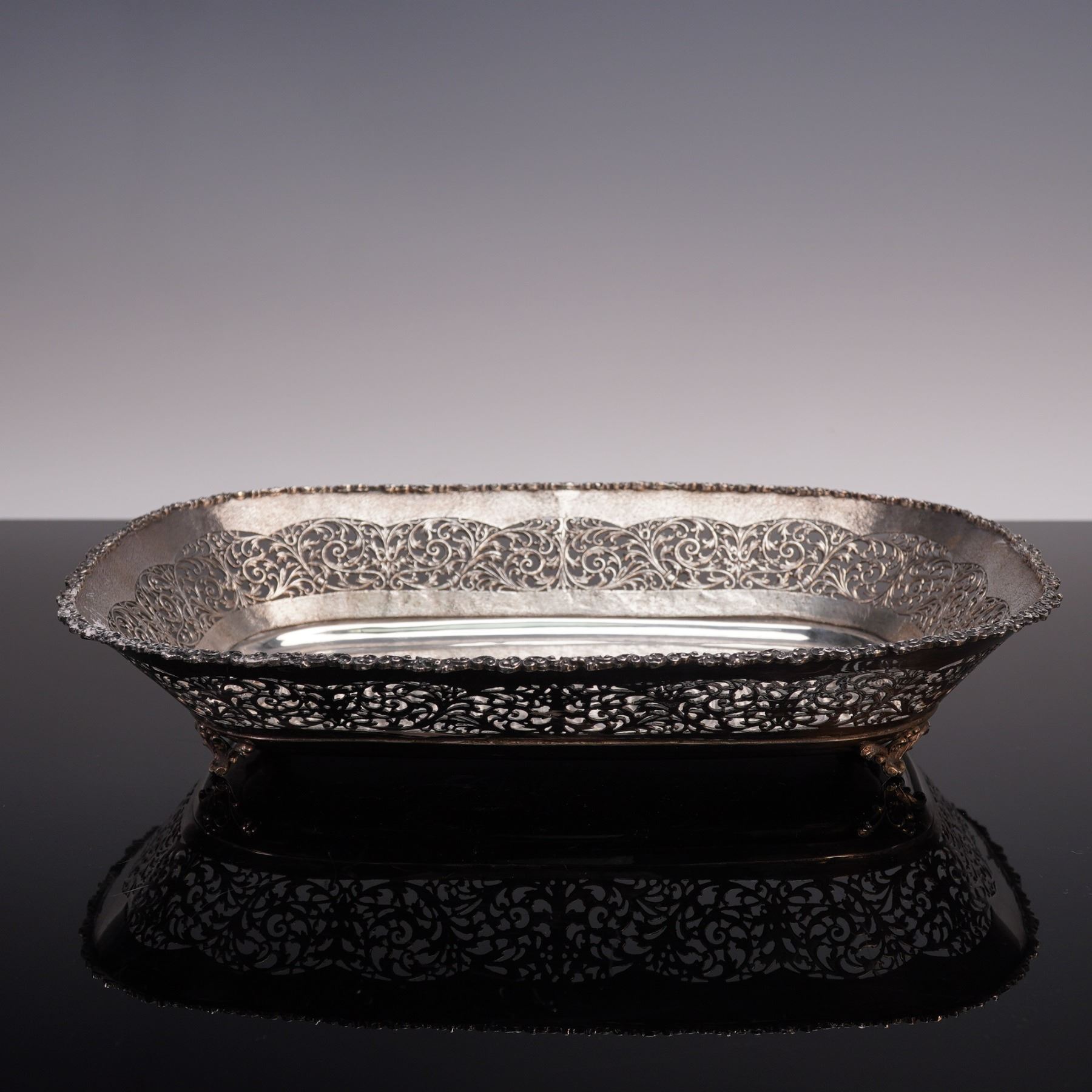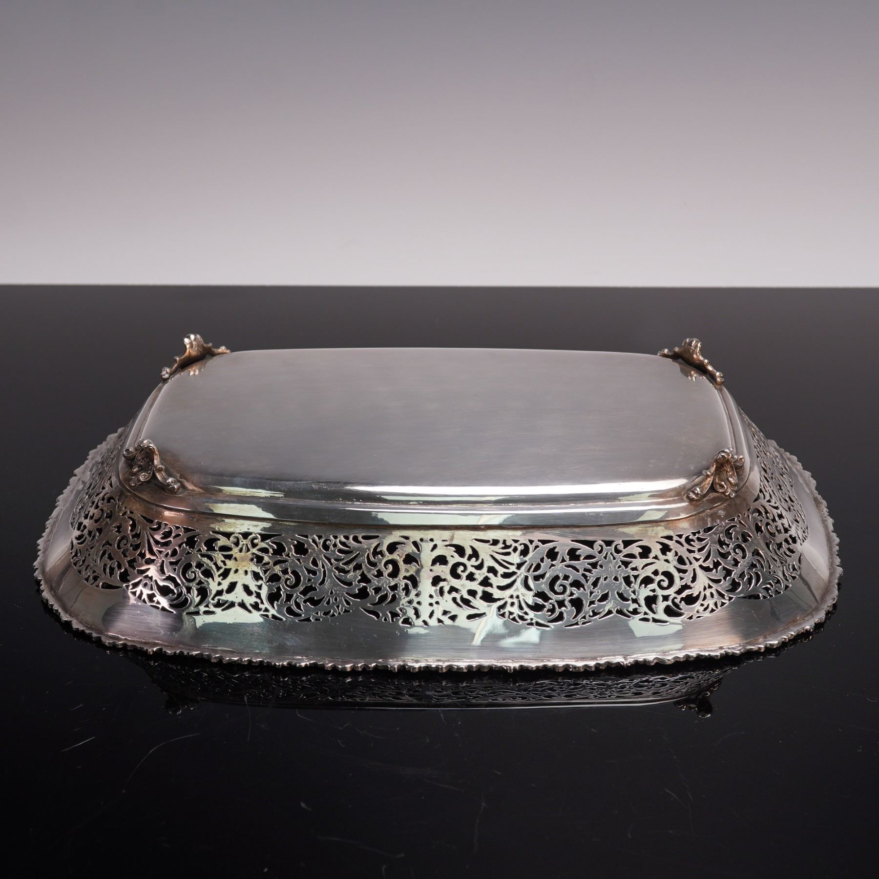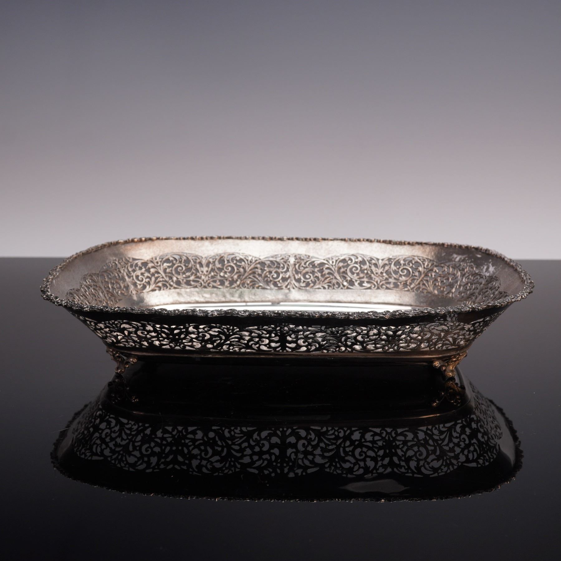 A rectangular .800 silver serving tray distinguished by its intricately reticulated border. The openwork comprising finely wrought scrolling foliate and tendril motifs in a continuous pattern of delicate symmetry. The tray rests upon four elaborately cast feet, each adorned with stylized acanthus ornamentation, imparting an elevated and balanced stance. Hallmarked makers marks .800. Net silver 18.85 troy oz.