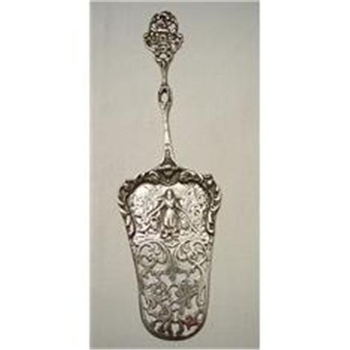 Silver Pudding slice engraved with a scene of waterwoman in a town. In the beginning of the handle has a mill. In very good conditions. In the back it?s stamped ?800?, ?HDD?, ?M?.