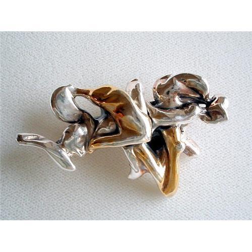 A very striking one-of-a-kind designer brooch crafted in silver 925 with accents in brushed gold. Sinuous curves in high relief with wonderful artistic dimension. Measures 2-1/4" inches wide, from east to west and just over 2" inches in height. Excellent and minty condition.
