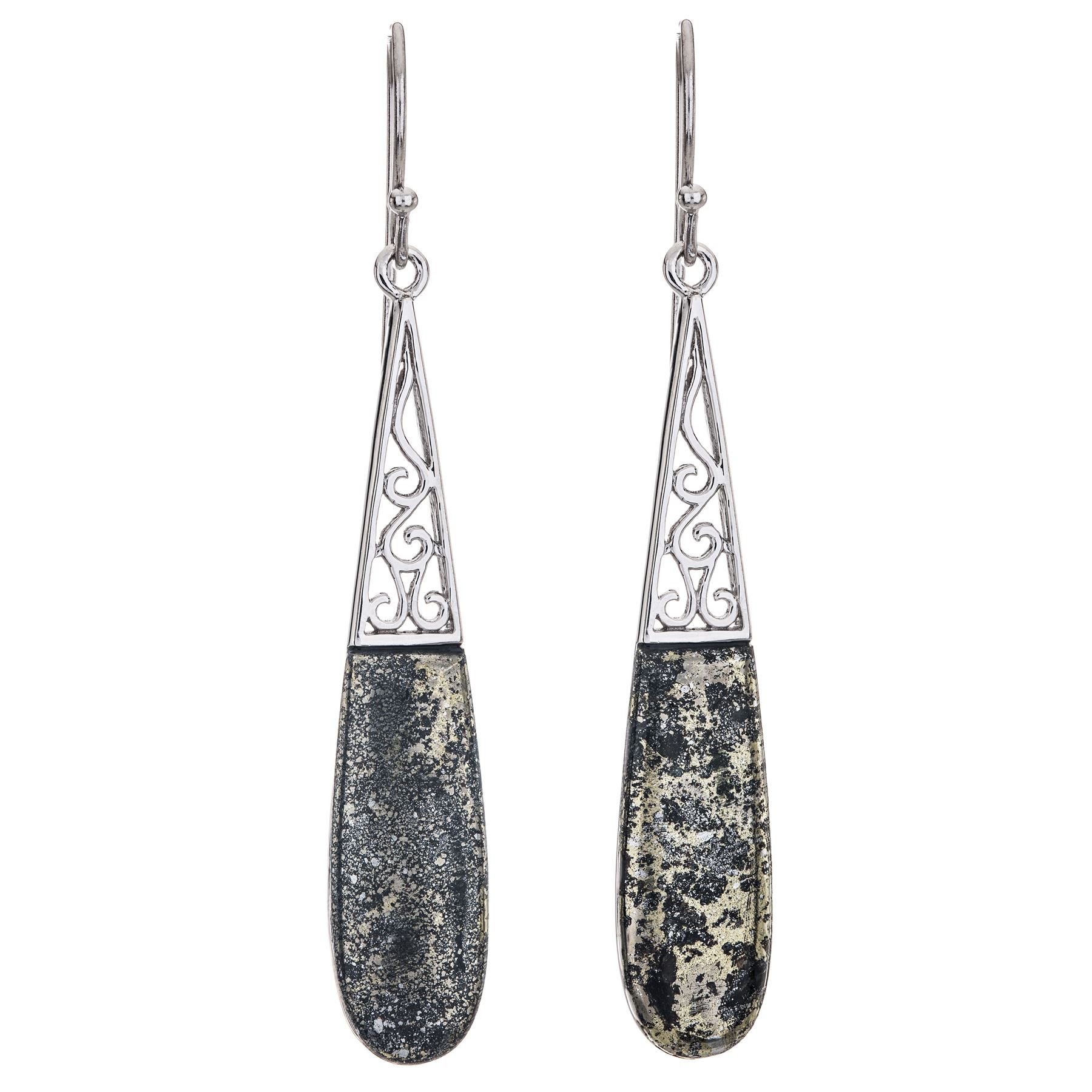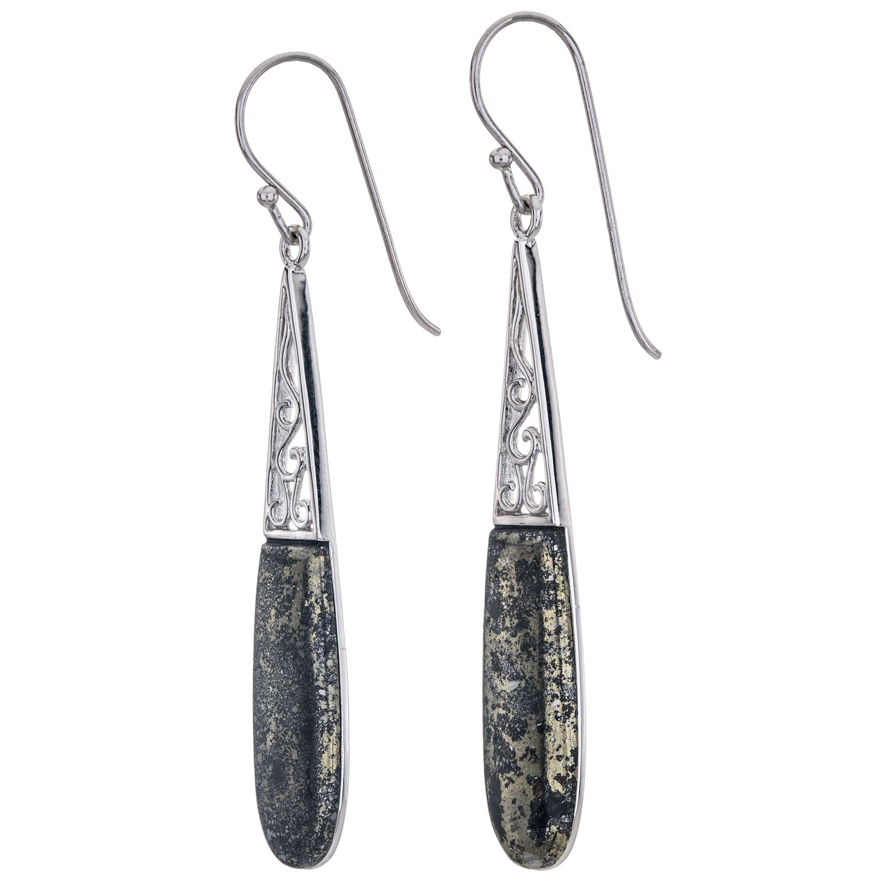 Pangea Mines creates a very beautiful, very feminine, very flattering look with these striking, elongated drop earrings. Crafted in gleaming rhodium over sterling silver and adorned with elegant Apache Gold pyrite complemented by intricate scrollwork, this lovely design offers sophisticated elegance to dress up any wardrobe. Convenient, comfortable shepherd hook backs complete the look.
