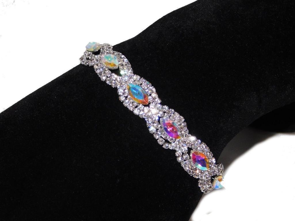 Upscale Designer Jewelry (Costume) Item Description Glamorous Sparkling Rhinestone Crystal Bracelet. With 1.1/2" Extend. Silver-tone Plated. Style: Bracelet Main Stone: Rhinestone Crystal Features: Lobster Clasp Material: Glass Color: Ab Iridescent Length (inches): 7" + 1.1/2" Metal: Alloy - 10089-040618-EB-40784
