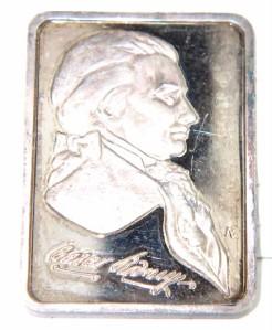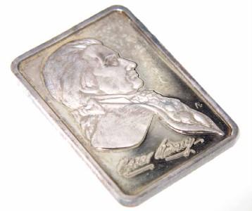 Silver Bar. The weight of bar is 32.2 grams. The measurement of bar is 44 x 31 mm, 2 mm in thickness.