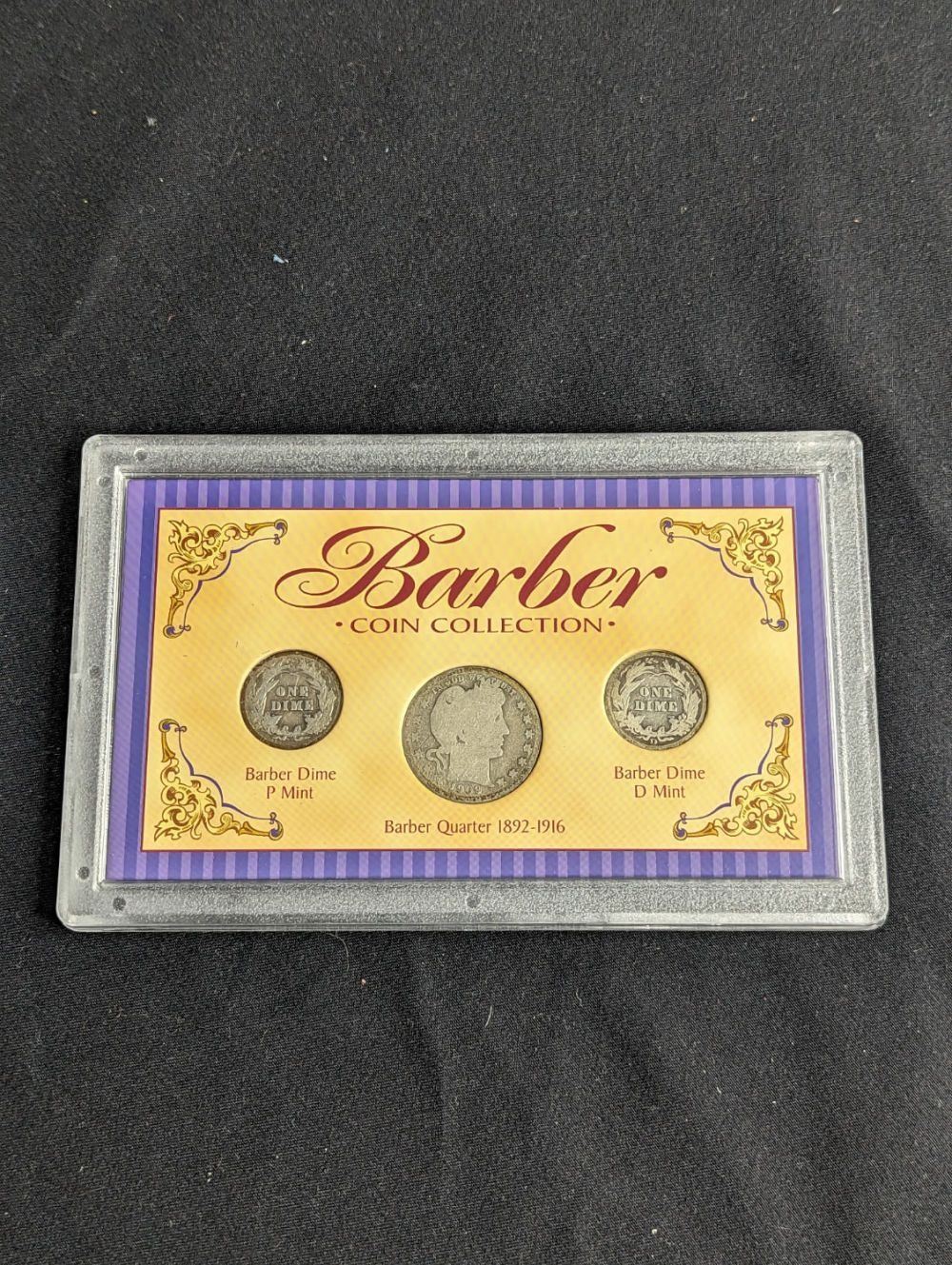 A Group of Three (3ct) Silver Barber Coins. A Barber Quarter and Two Barber Dimes. These Coins come inside a Very Nice Holder