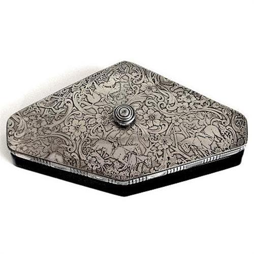 Produced during the 1920s-1930s this unique Art Deco or Art Nouveau cosmetics vanity set or make-up compact features an etched silver lid, with an ornate etching depicting hunting scenes with horses with riders and dogs intermingled with flowers, leaves and vines ? a truly outstanding design ? topped with a circular and stepped Art Deco finial. The base is black or black amethyst glass and has compartments for powder, rouge, lipstick and eyeliner ? remarkably the original puff, rouge + rouge applicator, and two silver holders, one with lipstick, one with black eyeliner are included still The lid appears to be Sterling silver but I do not know - it is incised with the number 3873. Has a diamond like shape, measures about 8 3/4" wide x 5" deep x 1" tall and with the exception of some tarnishing to the silver, due to age, the entire make-up compact is in excellent condition without any damage.