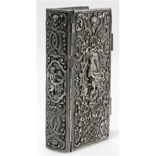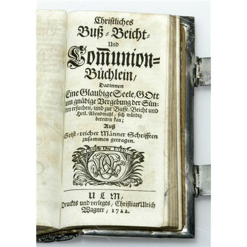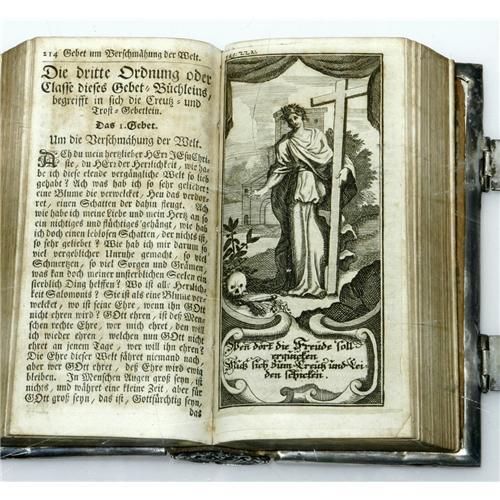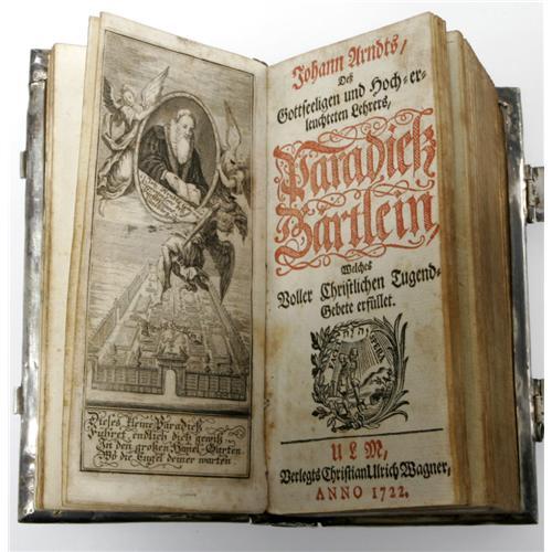 <B>(Silver Binding) Johann Arndt <I>Des Gottseeligen und Hoch-erleuchteten Lehrers Johann Arndt Paradies-Gaertlein Welches Christlichen Jugend-Gebete erfuellet</B></I>.</B></I> (Ulm, 1722), 1722 edition, 518 pages, seven engravings, bound in silver, narrow 12mo. Title page in red and black, engraved frontispiece and other fine engravings, endpapers are hand-blocked Dutch paper. An unusually delicate, yet elaborate silver repousse binding. The backstrip centers an angel against a chased background within a mitred panel, intertwined ribbon scrolls and floral drops in repousse complement the design in geometrical sequence, a basket of flowers at foot of spine and child's head at top bring the design into focus within a border of dots and thread rules. On the front cover a symbolic feminine figure holding a cross, and with a lamb at her feet, is the focal point of the elaborate design of interlaced ribbons and floral sprays, all in repousse. The figure is most beautifully modeled, as is the shell and head which tie the design at the top of the cover. The rear cover centers a symbolic feminine figure holding an anchor posed against a background of a stylized sea and a small boat. The supporting design duplicates that of the front cover. The clasps are beautifully chased with sprays and dots and thread borders and are in perfect working order. From the Henry E. Luhrs Collection.