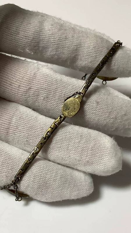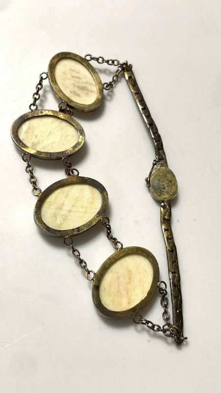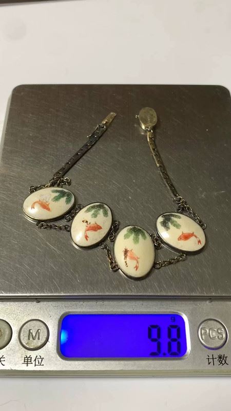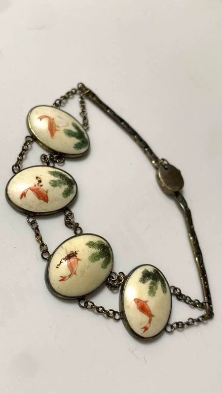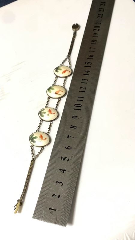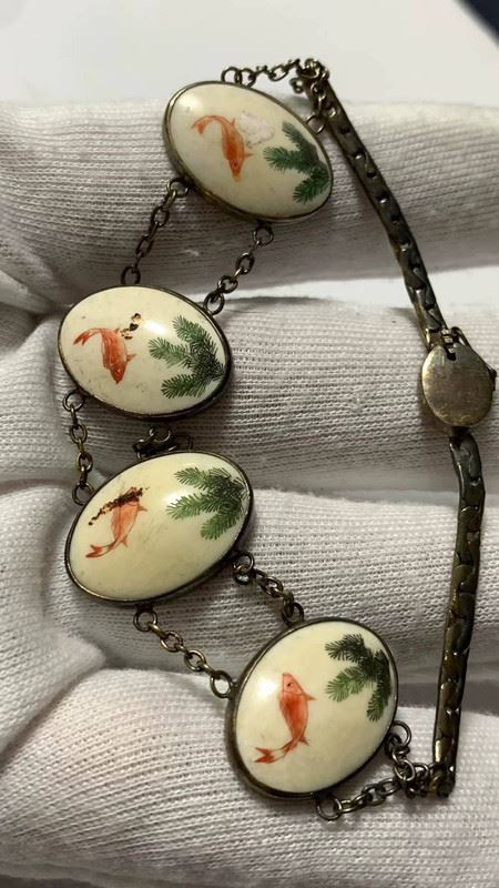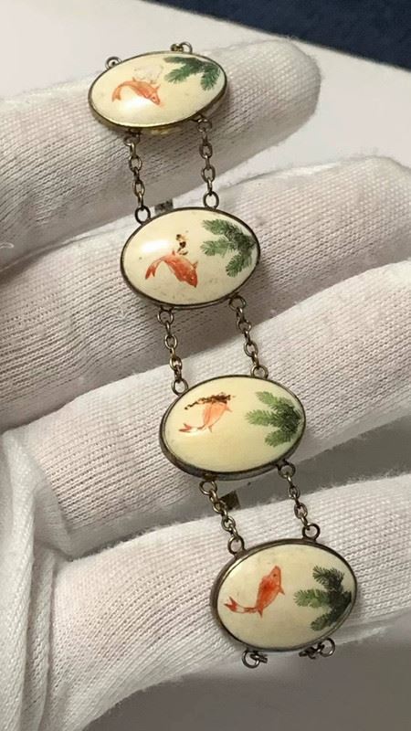 This bracelet features delicate sterling silver combined with mammoth ivory microcarvings, depicting a natural scene of goldfish and water plants. Each ivory piece is hand-carved with intricate details and colors, showcasing both exceptional craftsmanship and a unique, classical aesthetic.