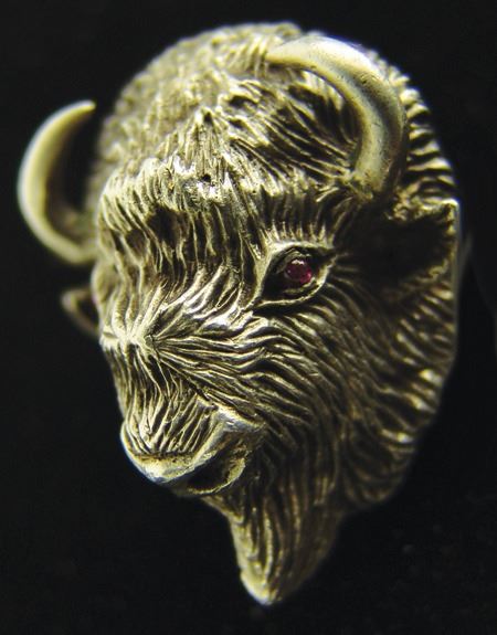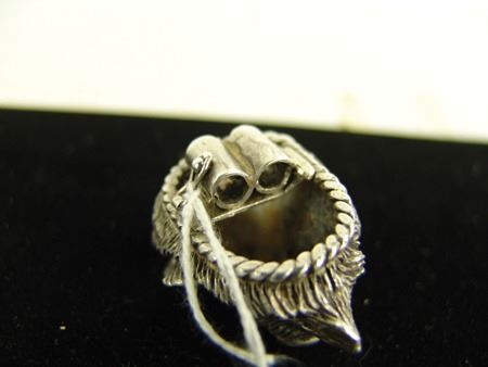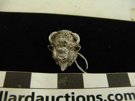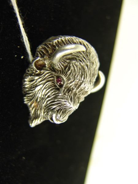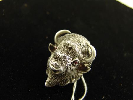 Ca. 1980s, Heavy cast and carved all-silver bolo slide done as a buffalo head and with inset garnet eyes. With unique locking latch. Very good condition.. 1-1/2"