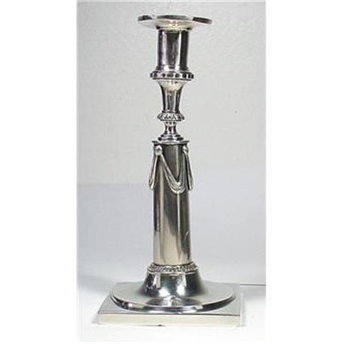 Silver candlestick made in Augsburg, Germany. The refined and understated design is in the form of an urn atop a festooned column. The column sits on a fluted base, which in turn sits on a square base. The bobeche and socket sit atop the urn. The bobeche rim is slightly out of line. The Augsburg pomegranate mark and a maker's mark of IRH (Johann Rudolf Haller 1757-1844) appear on one side of the base.