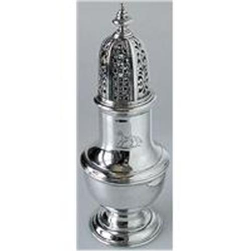 A baluster caster with panelled top and stylised urn finial by Samuel Wood, circa 1740 (maker's mark twice) crested with a fox.