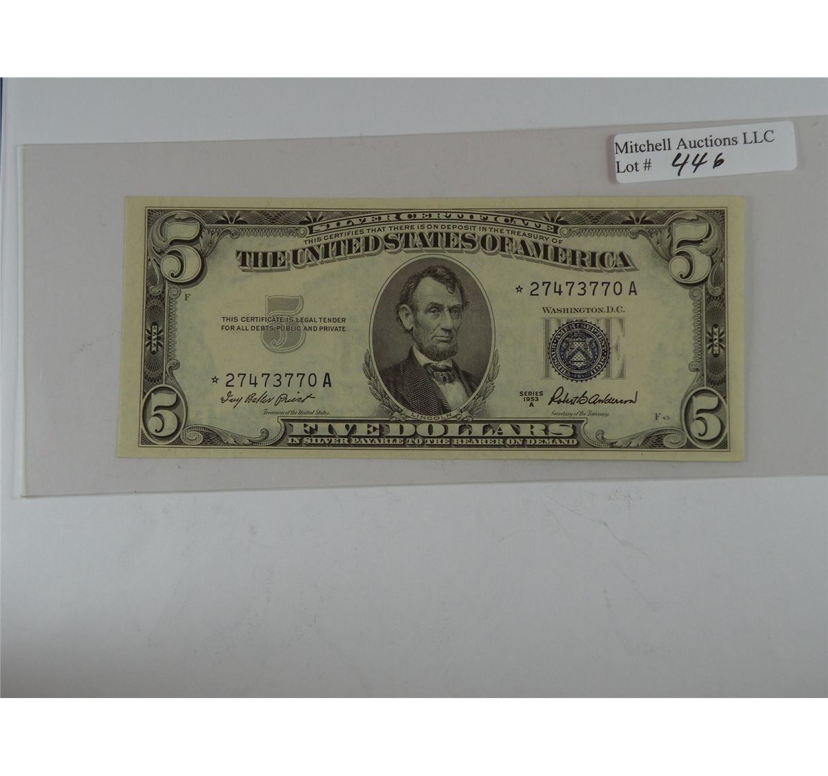 Silver Certificate $5 Series of 1953-A Star Note. Ch. Crisp Unc. or better. Scarce. Est.$60