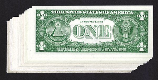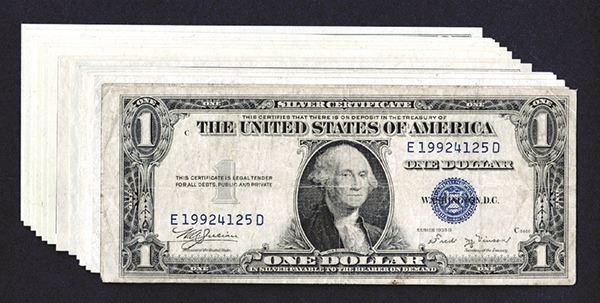 Silver Certificates. $1. 1928 Fine, 1935B Fine, 1935C VF, 1935D (2)VF, 1935E, 1935F, 1935G, 1957, 1957A (3), 1957B (2). No Star notes. Uncirculated except where noted. 14 pieces.