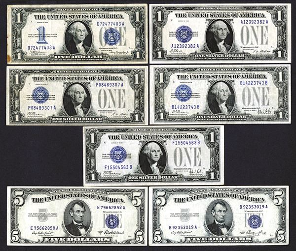 United States. 1 Dollar, 1928, 1928A, 1928 B (2), 1934; 5 Dollars, 1953, 1953A. Very Good to Very Fine, one or two with stains. $15 face. 7 pieces.
