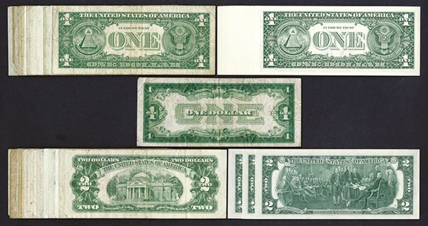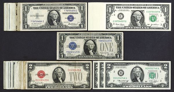 Silver Certificates. $1. 1928B, 1935A (3), 1935 E (2),1935 F (2); 1957, 1957 star (3); 1957A (3), 1957A star (2); 1957B (2). Federal Reserve Notes: $1 2003 (18) Uncirculated; $2. 1976 (3); United States Notes: $2. 1928G (5), 1953 (2), 1953B (2), 1953C (3), 1963 (4), 1963A (4). A few are uncirculated. Most Good-Very Good. 60 pieces.