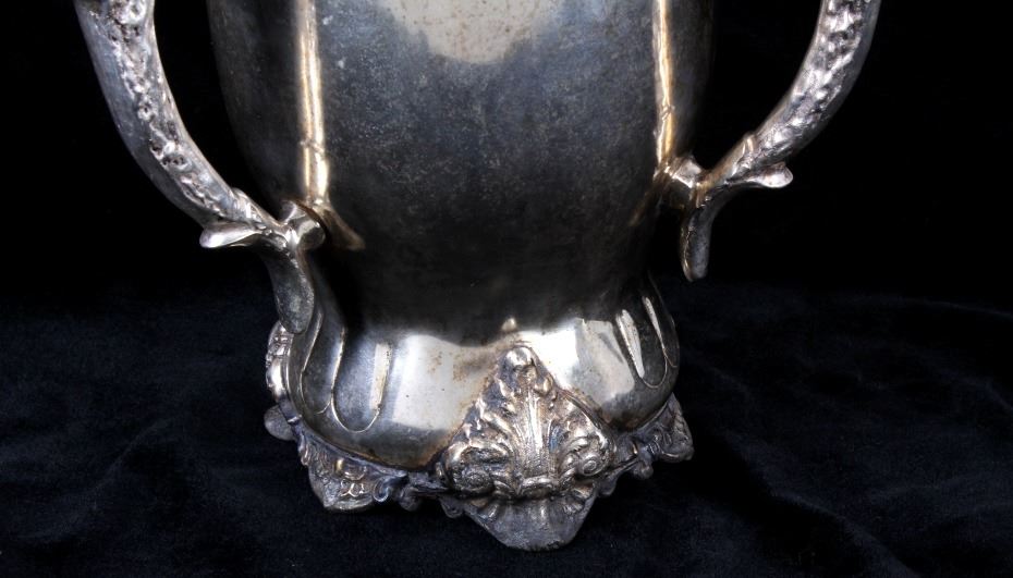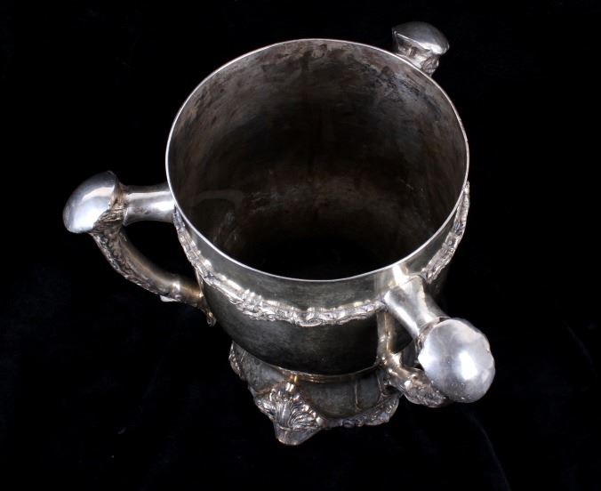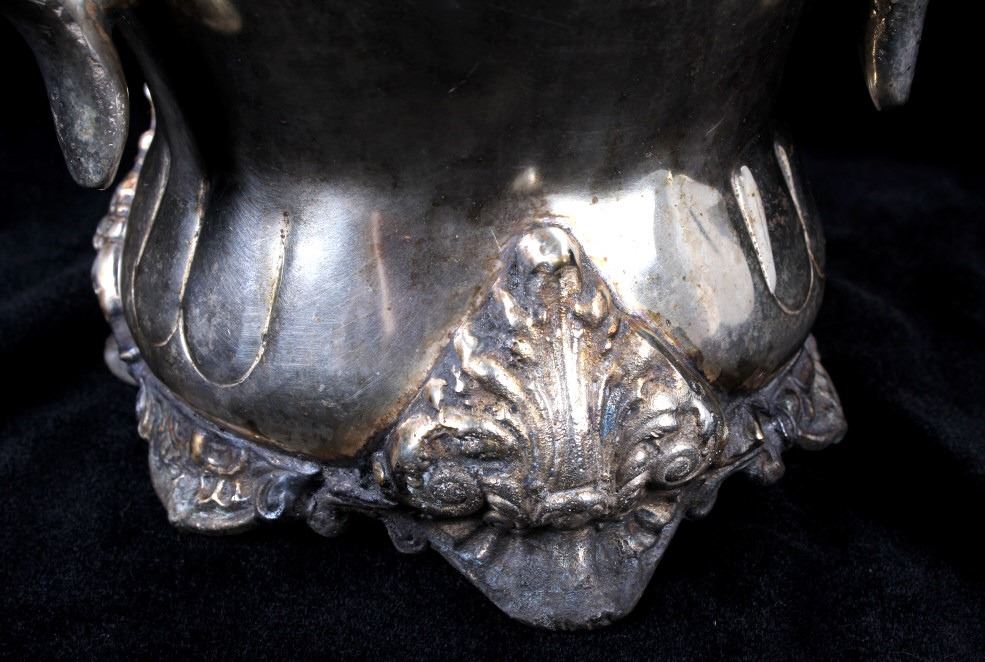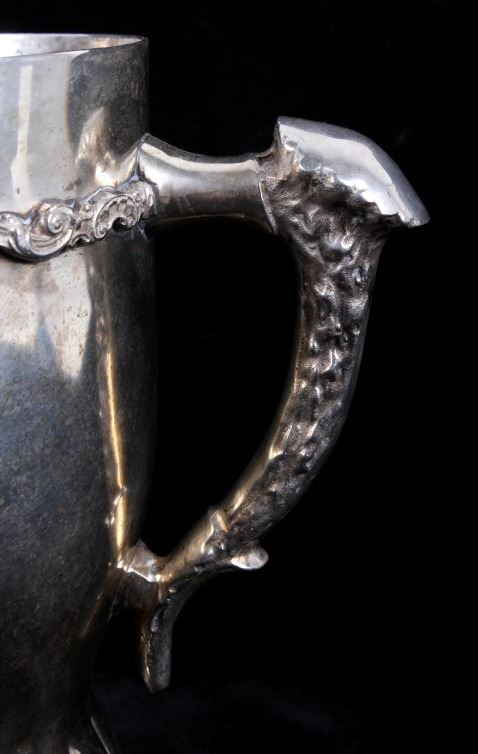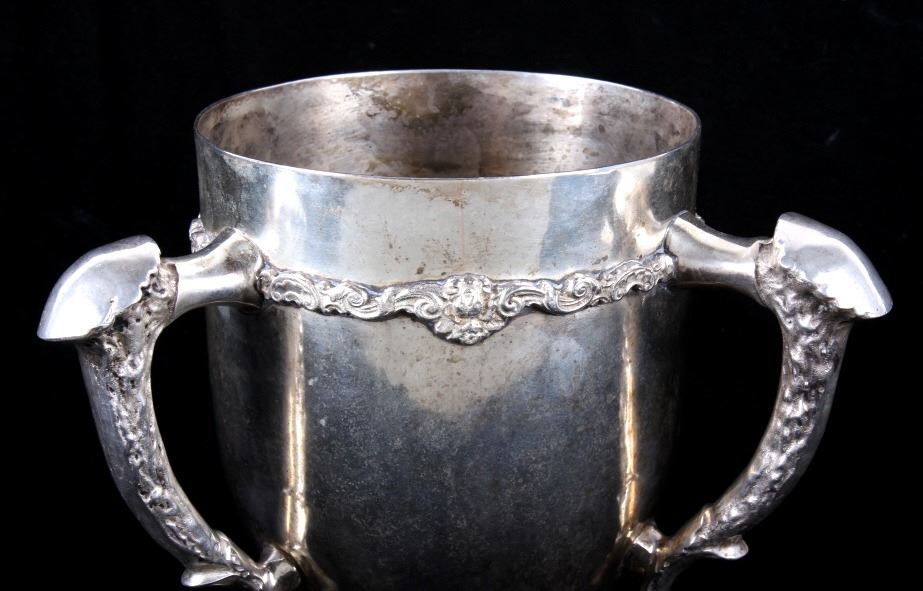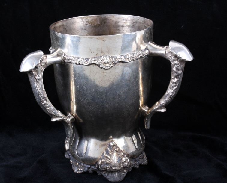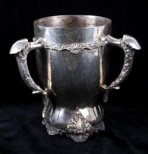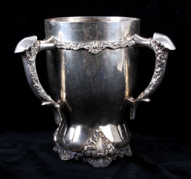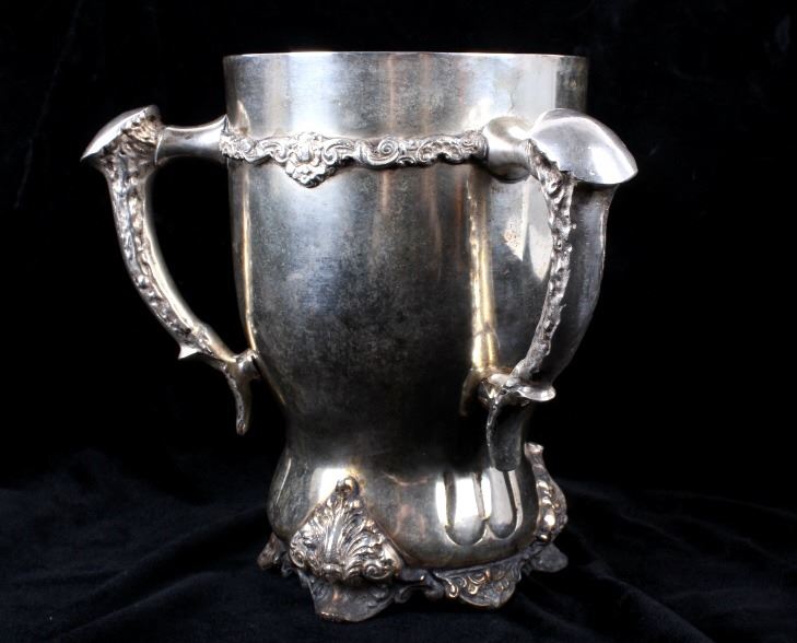 Offered in this lot we have a ornate silver champagne cooler with a set of three handles. The cooler shows ornate silver patterning along the top and base of the cooler. It originates from the late 1800's to early 1900's. The three handles are silver plated and are shaped like the base of stag horns. The cooler shows good condition overall with spots of warm patina indicative of age. The cooler measures 9" long by 10 1/2" at its widest by 6" in diameter.