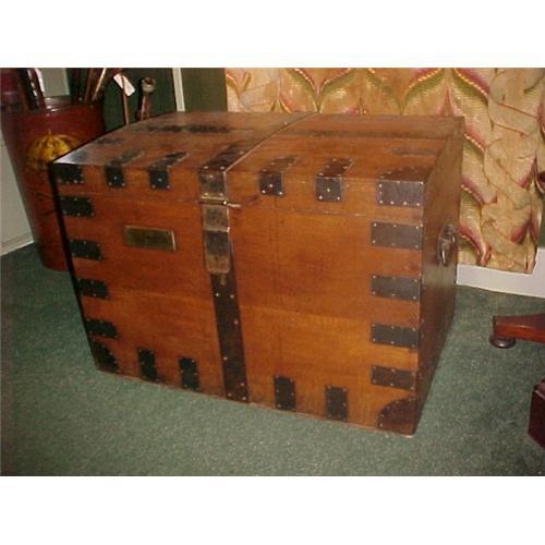 A wonderful oak chest with iron binding. These chest where made to hold the family silver service in Victorian English Manor homes so that the servants could not easily steal it while families where on holiday. There are three individual locks hidden behind the hasp. They where requested by The Chubb Insurance Company and are often called "Chubb Chest."They are beatifully made, with dovetailed