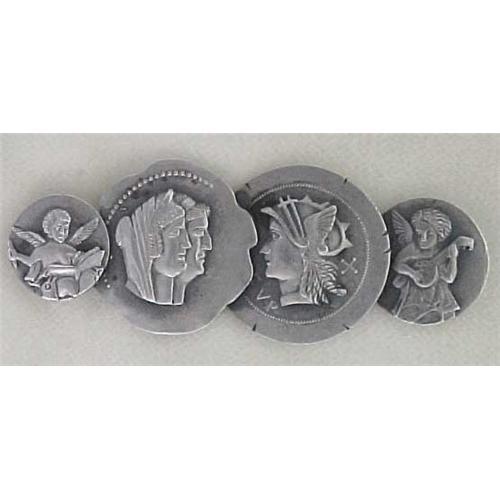 This is a late Victorian silver pin, c. 1900. The pin consists of four overlapping irregular circular disks with facing classical profiles and cherubs. The pin measures 2 1/2" x 15/16" and is in excellent condition. Similar pins are pictured on p. 80 of Warman's Jewelry, 3rd Edition. The pin is not marked, but tests silver.