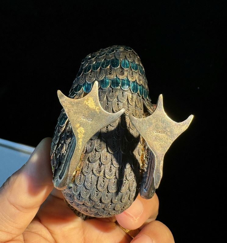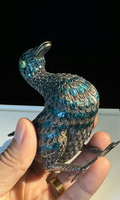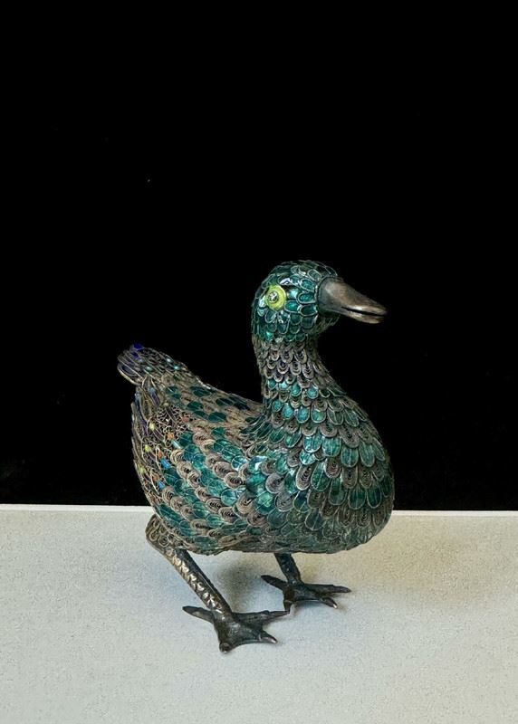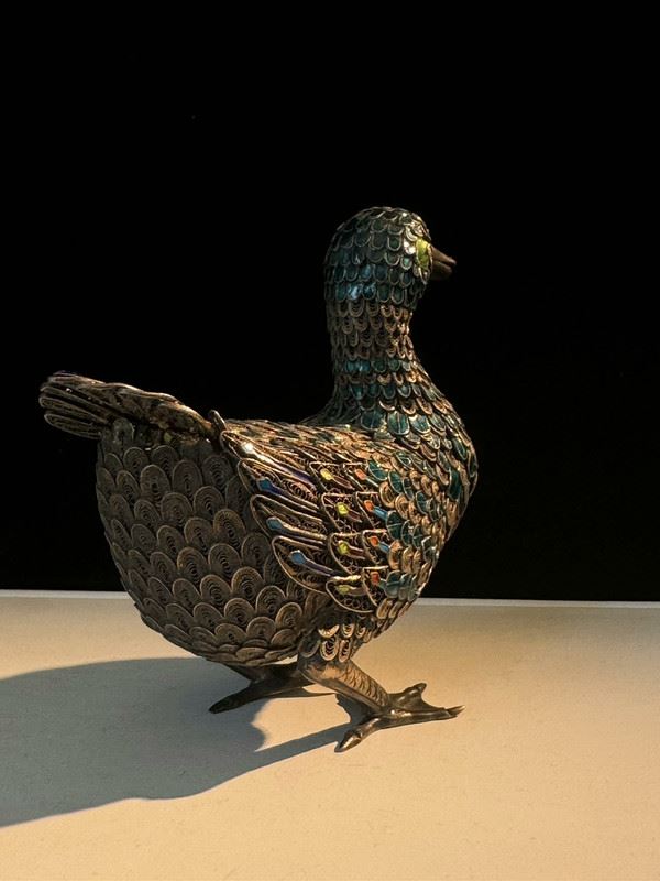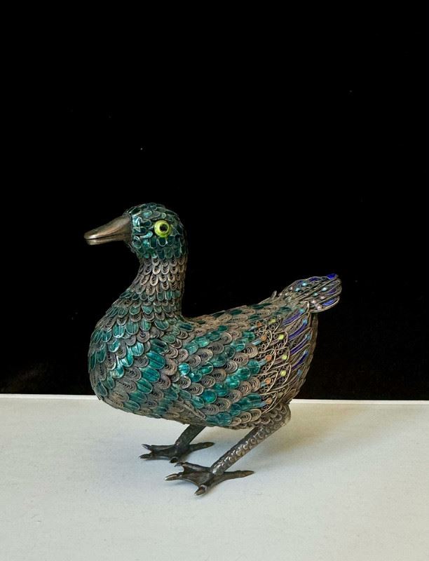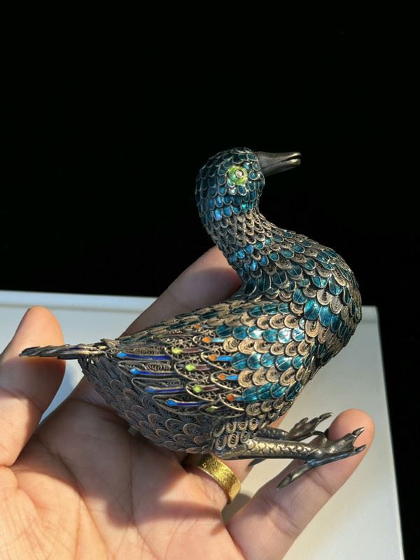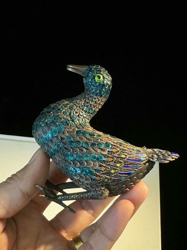 This duck figurine is crafted on a silver base with cloisonné enamel techniques, featuring feathers in vibrant shades of blue, green, and purple, rendered with intricate detail. The lifelike form and vivid colors highlight superb craftsmanship. Serving both as a decorative object and a symbol of peace and prosperity, it is a fine piece of art with significant collectible value.