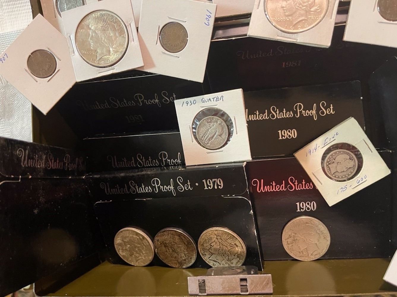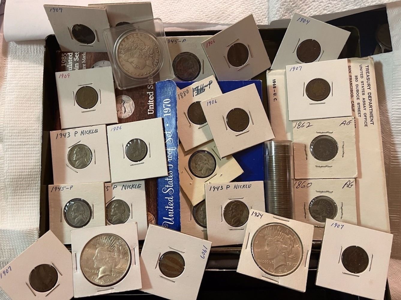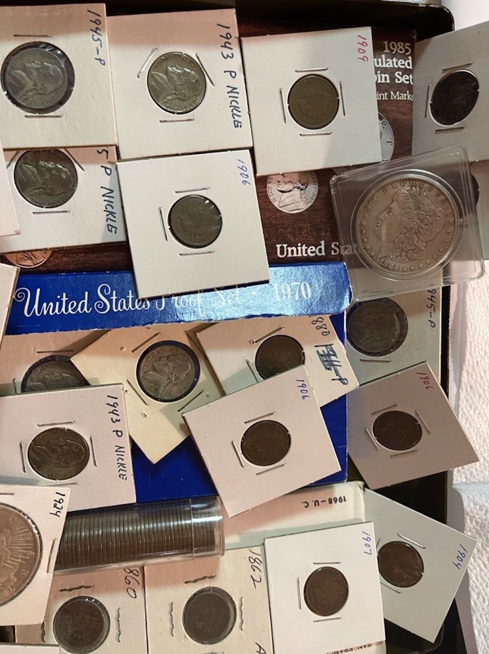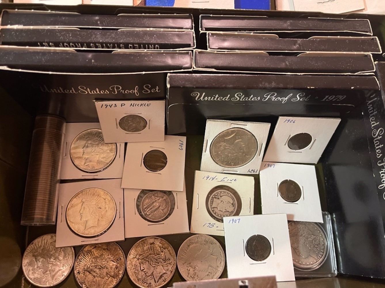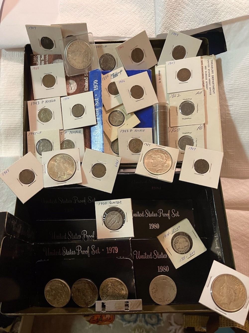 Silver coin treasure trove, strong box full of silver dollars, ware time silver nickels, proof sets, Indian head pennies, etc. Strong box not included.