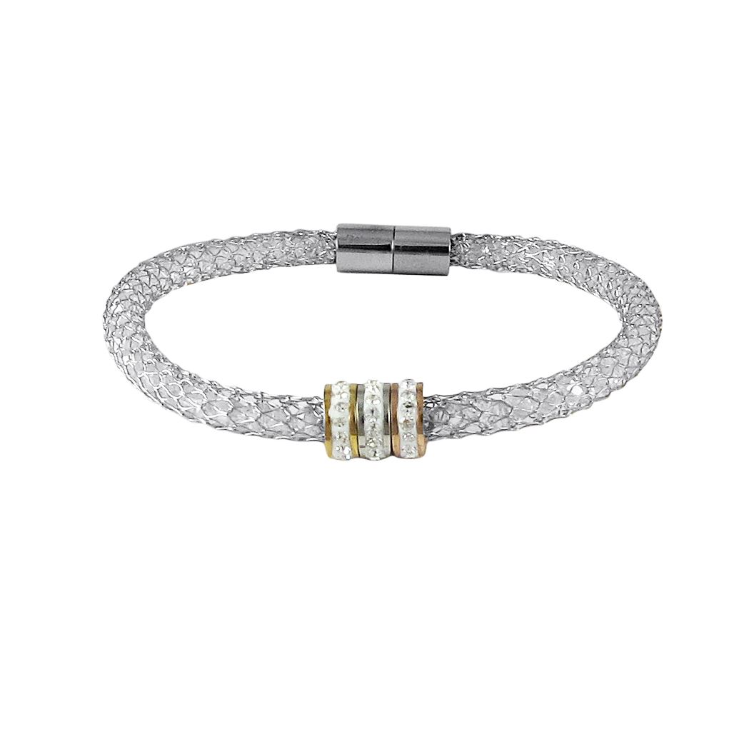 Silver Color Mesh With Beads Bracelet. 3 Round Rondells With White Czs.-7"
