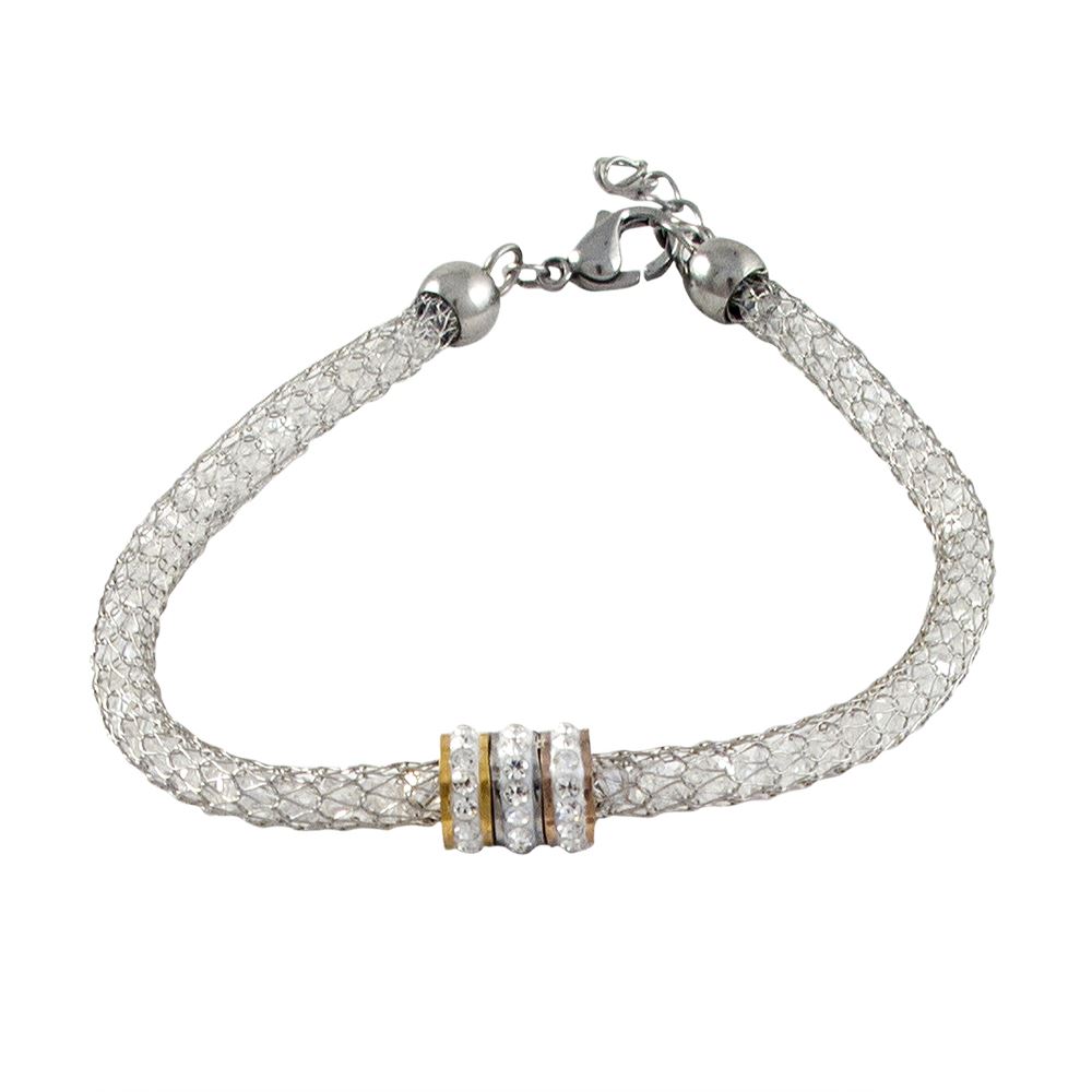 Silver Color Mesh With Beads Bracelet. 3 Round Rondells With White Czs.