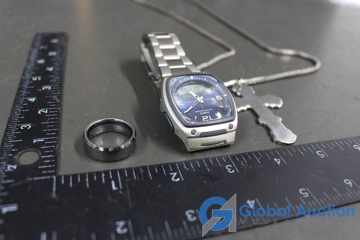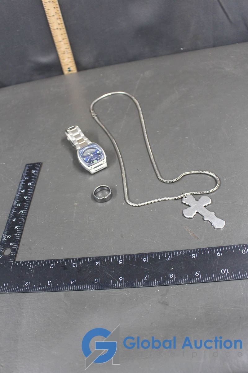 Silver Coloured Casio Men's Watch, Tungsten Silver Coloured Ring and Silver Coloured Cross & Chain