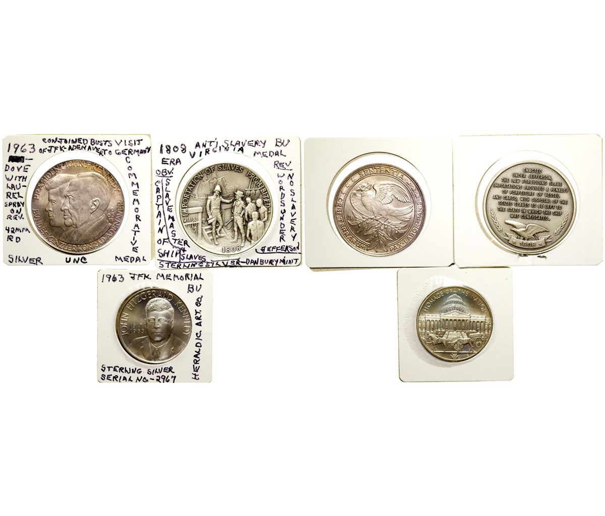 Lot of 3: 1)JFK Memorial, 1963, Heraldic Art Sterling silver; 2) Anti slavery Danbury Mint sterling silver medal; 3) 1963 Kennedy/Adenauer commemmorative, 42mm, silver, Unc. -61010