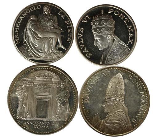 2 beautifully designed silver commemorative medals in honor of Pope John Paul VI. 1 medallion is brilliant proof quality approximately the size of a silver 50 cent. The other is a lustrous larger medal approximatel