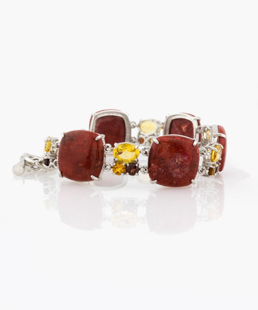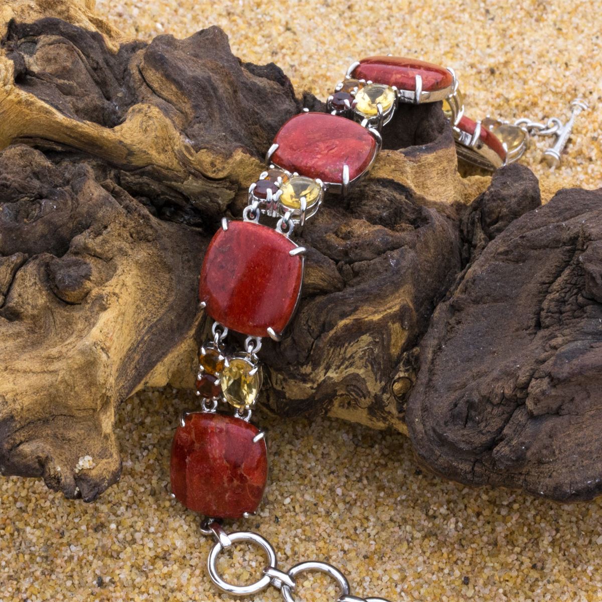 Pangea Mines impressive toggle bracelet is crafted with large cushion shaped coral in individual stations alternating with three-stone stations in a gleaming sterling silver setting to create a sparkling accessory. You’ll love the smart toggle design that adds comfort, great looks and versatility—wear at 6.75", 7.25" or 7.75" lengths. Brighten your collection today with this lovely contemporary look!