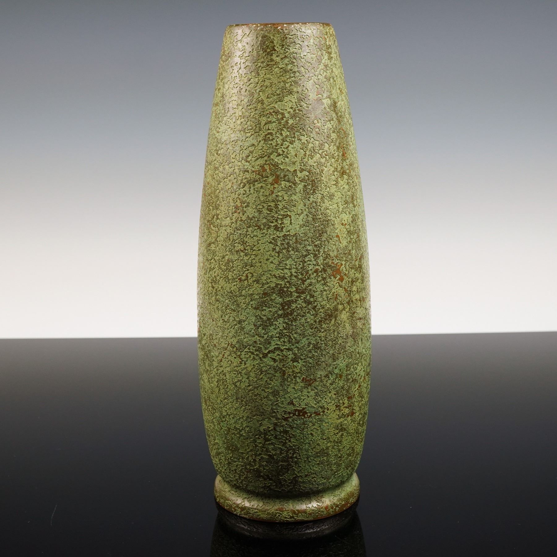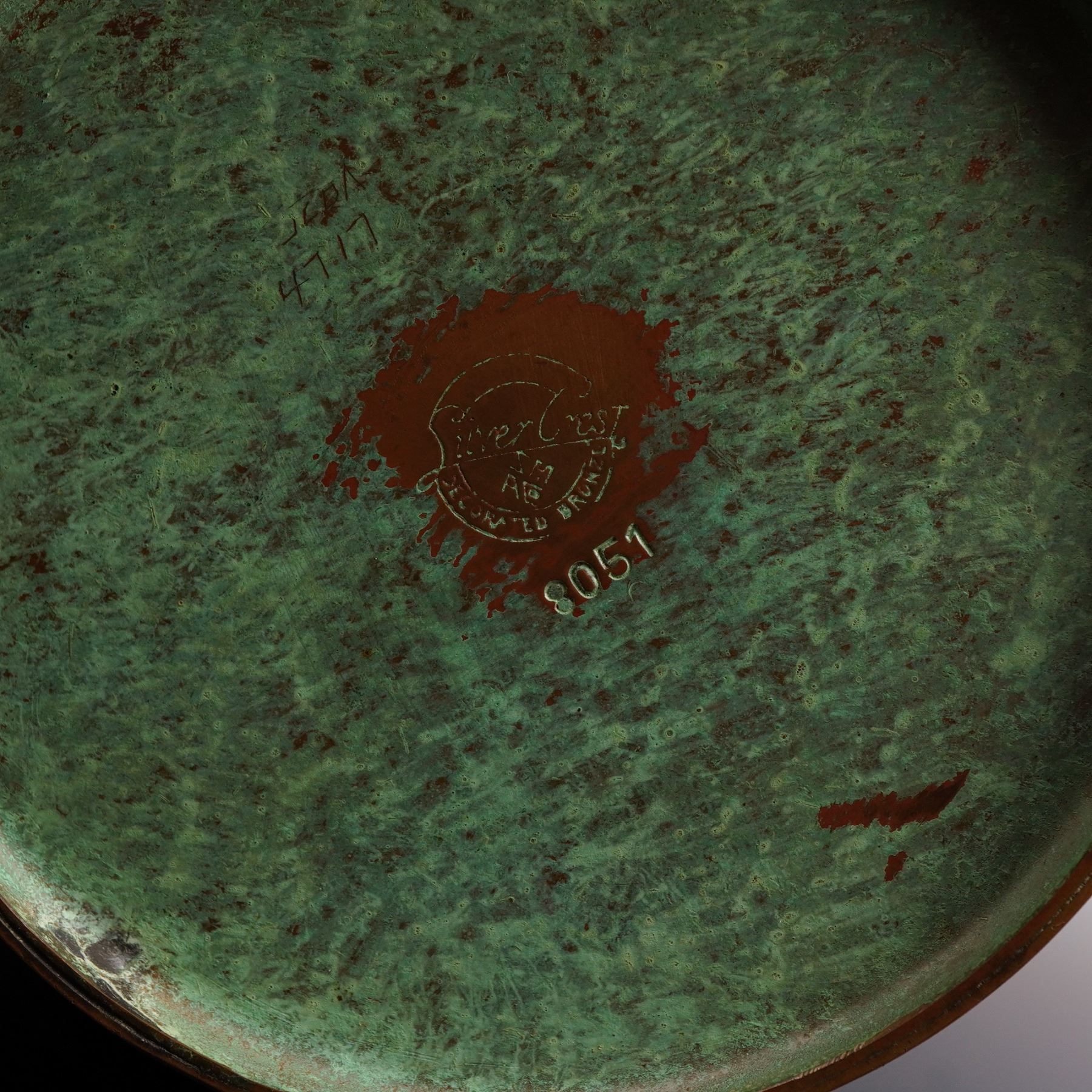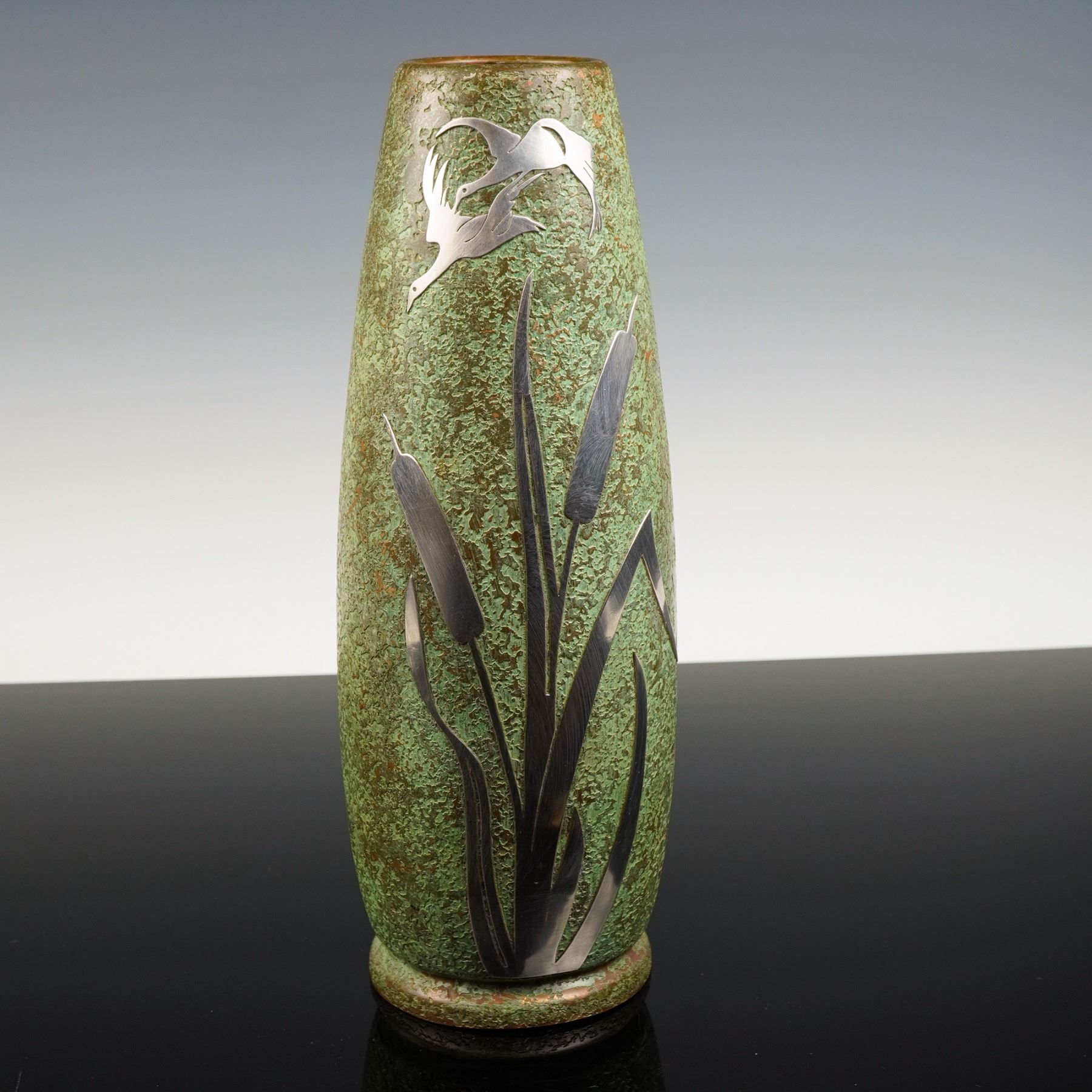 A tall, elegant decorated bronze vase, model number 8051, featuring a sterling silver overlay design of cattails and flying cranes in flight. The mottled green and russet surface enhances the naturalistic feel, evoking a tranquil marsh scene. The sleek sterling silver contrast beautifully against the textured background. The underside is marked Silver Crest A9 Decorated Bronze with the number 8051.